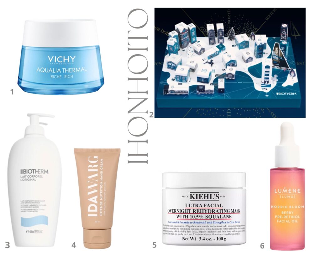 *1. Tehokkaasti kosteuttava suosittu voide Vichyltä *2. Biothermin laadukas ihonhoitoon erikoistunut joulukalenteri 2024 *3 Ihoa hellivää kosteutta isosta purkista *4.Tehokkaasti pehmentävä käsivoide kuiville ja halkeileville käsille *5 Kasvonaamioiden aika on juuri nyt *6 Tehokasta kosteutusta kasvoöljyllä
