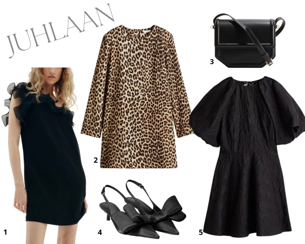 *1 Musta röyhelömekko *2 Leopardi kuuluu juhlakauteen *3 Laukku juhlaan ja arkeen *4 Juhlakengät saavat näyttää juhlakengiltä *5 Upea jakardikankainen mekko iltamenoihin