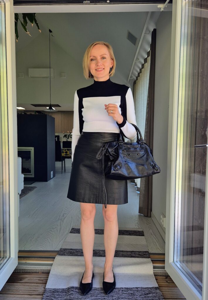 Sitä viileyttä peläten ajattelin pitkähihaisen olevan hyvä valinta. Tämä paita on second hand löytö, HM x Balmain mallistoa. Tykkään kovasti paidan tyylistä ja laukuksi valitsisin vanhan Balenciaga Cityn.
