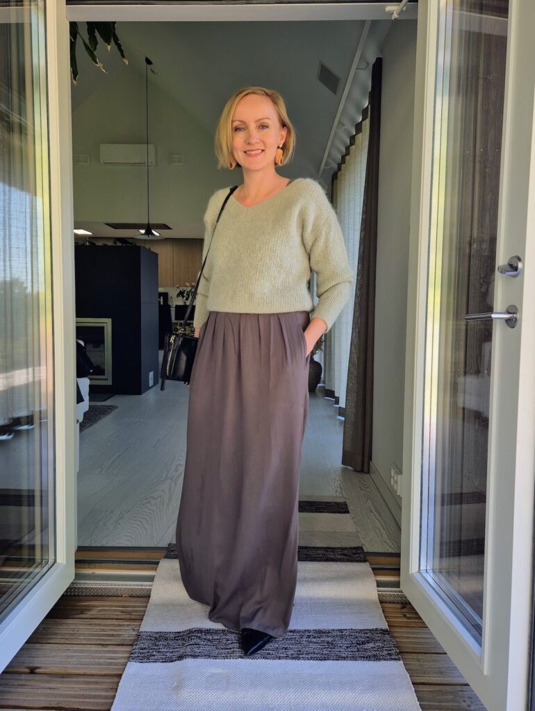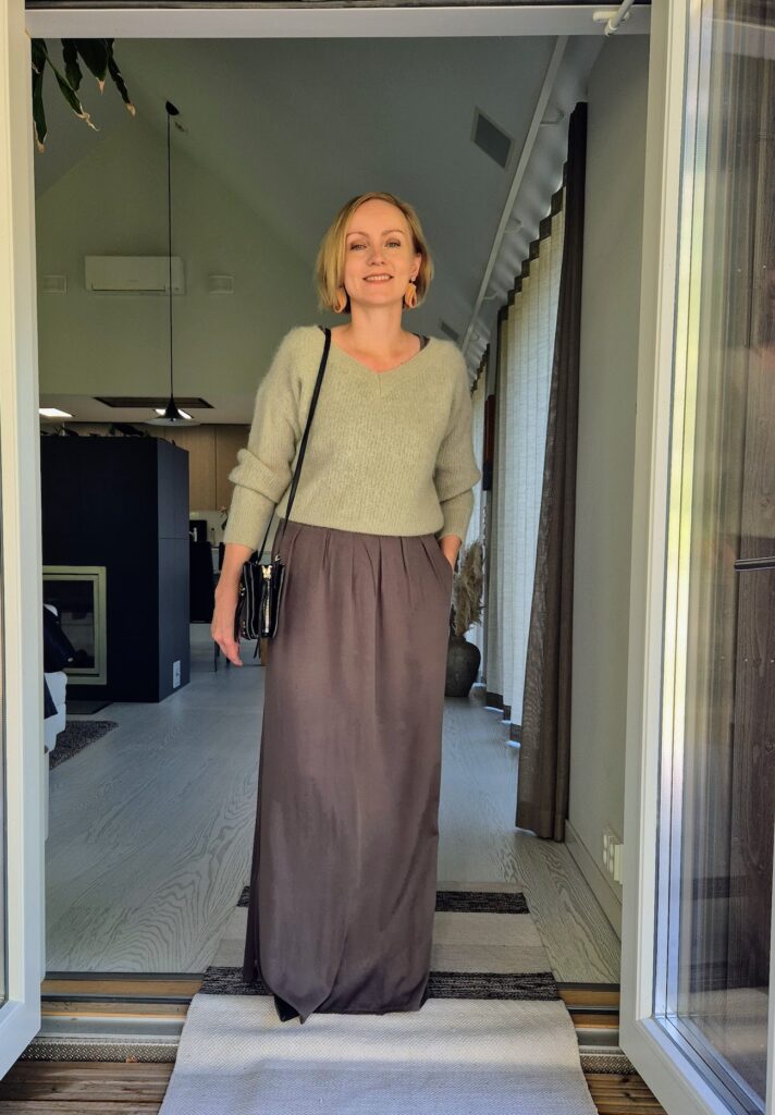 Niin paljon sitä viileyttä ajattelin tuossa, että yksi villapaita-asukin mietinnässä. Syksyn trendivärit sattumoisin ylläni, eli vihreää ja ruskeaa. En tiedä, voisihan se keikka tuntua ihan hyvältä rennossa mekossa ja villapaidassa. Tosiaan siellä istutaan, oletan, ellei kaikki muut riehu paikallansa niin sitten minäkin.