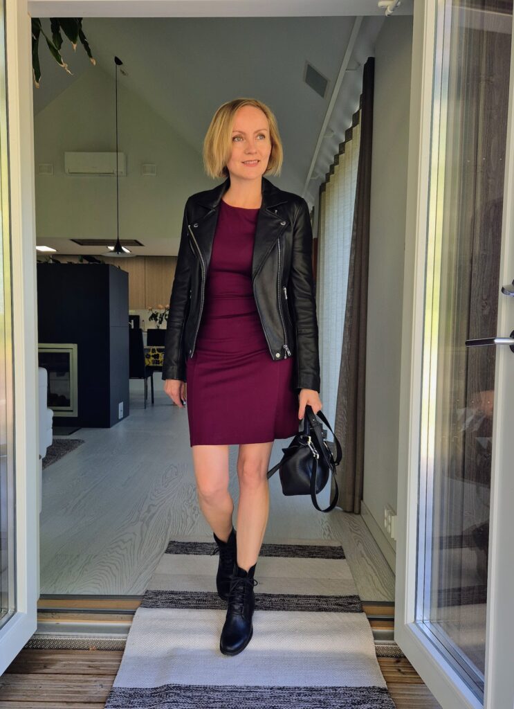Aloitetaan perinteisellä. Mekko ja nahkatakki – aika kelpo setti keikalle sanoisin. Olen tämän Filippa K:n luumunvärisen mekon joskus nettikirpparilta ostanut ja edelleen tykkään tosi paljon. Paljon käyttämäni SamsoeSamsoe -nahkatakki sekä Loewen laukku ovat second hand löytöjäni parhaimmasta päästä.