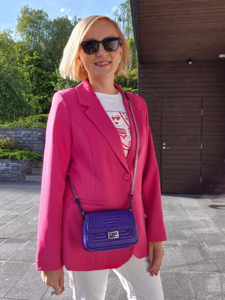 Lopulta hertta-akka jäi päälleni ja vedin sen kaveriksi valkoiset kapeat housut ja pinkin bleiserin ylle. Ei 100% juhlava, mutta tarkkaan ottaen pukukoodia illan tilaisuuteen ei ollut. Mieheni laittoi pikkutakin ja minä päätin, että tällä asulla nyt mennään. Violetti Fendin laukku tuntui viimeistelevän asuni sekä valkoiset lenkkarit, joita koululaisemme käytti viime talven lomallamme. Minun kengät siis alun alkaen, mutta tätä nykyä jalkamme on samaa kokoa.