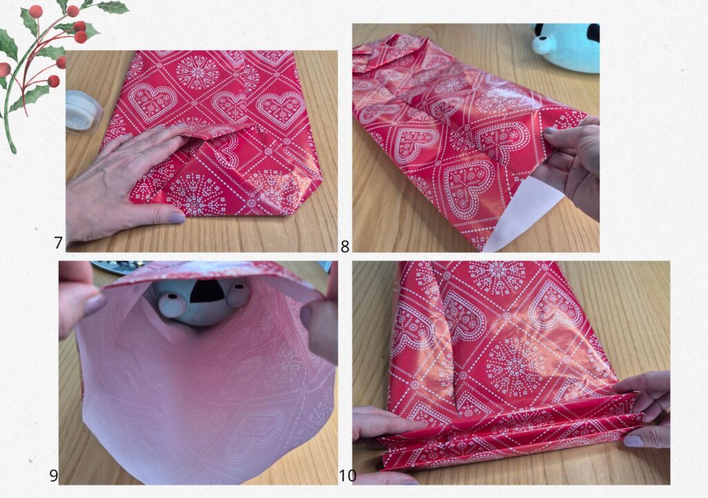 8 ja 9. Käännetään pussukka avonaisen suun puolelle ja sujautetaan lahja pussiin.