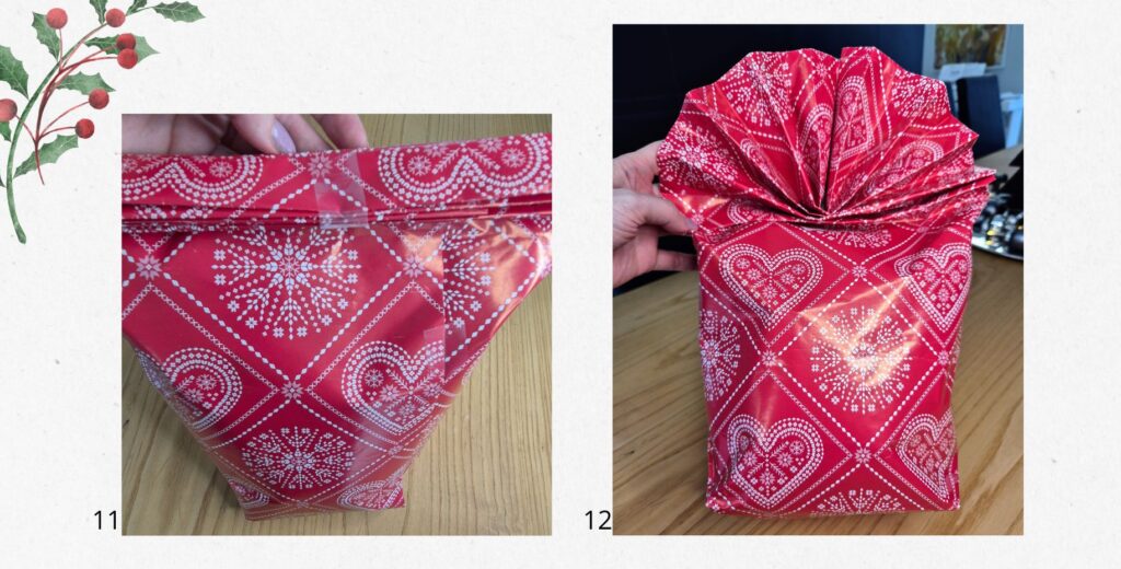 12. Nyt siivet voi nostaa pystyyn ja teipata keskeltä kiinni toisiinsa. Nätti paketti valmis. Koristeruusuke halutessa kylkeen.