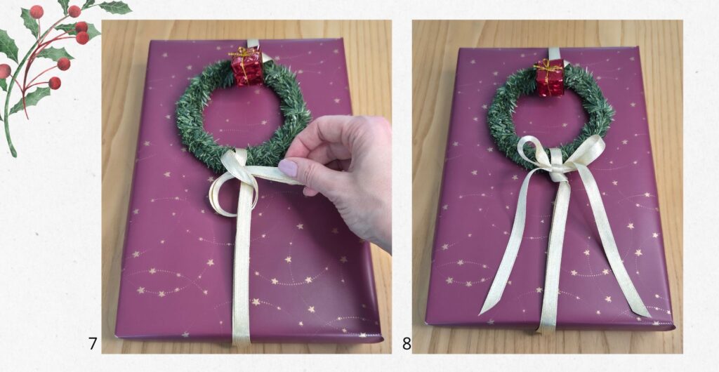 - Kiepauta naru paketin takakautta takaisin eteen ja pyöräytä kranssin alaosan ympäri.