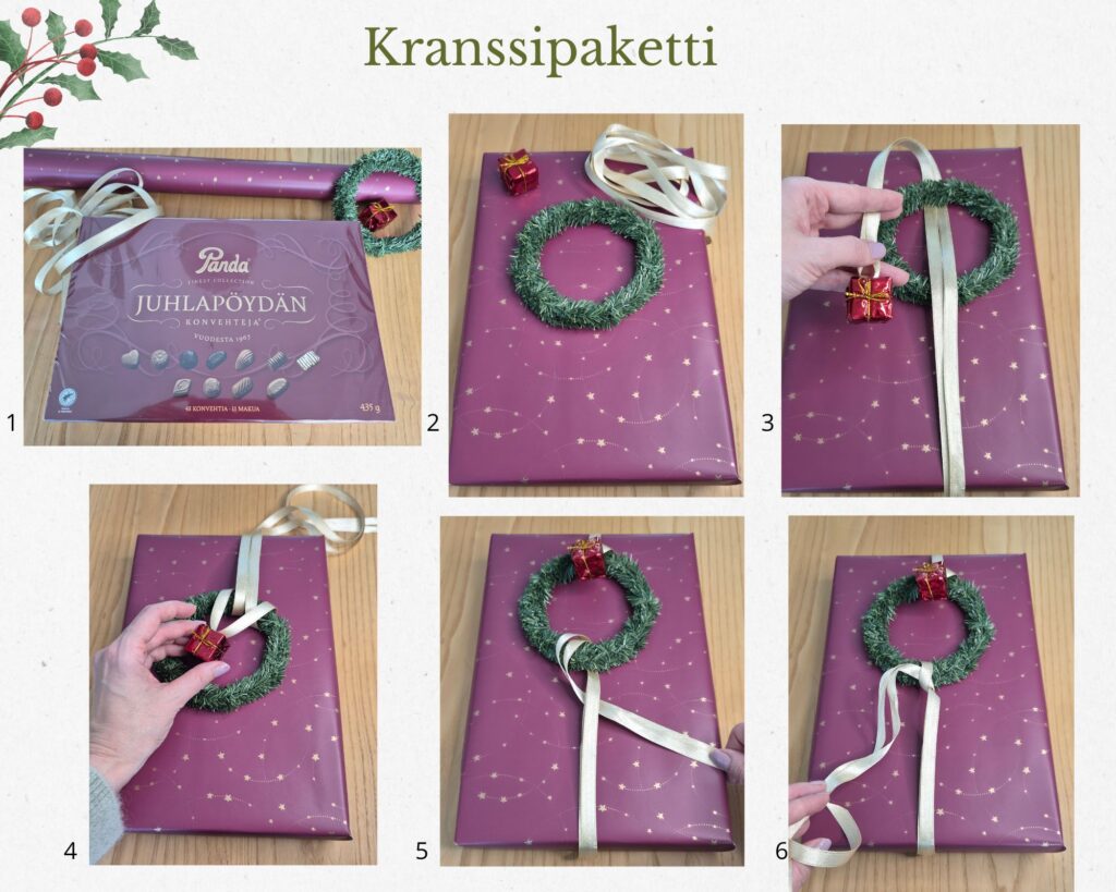 Toinen idea liittyy peruspakettien koristeluun. Jos joulutervehdys on suklaarasia tai kirja, niin pakettia on helppoa piristää pienellä vaivannäöllä.