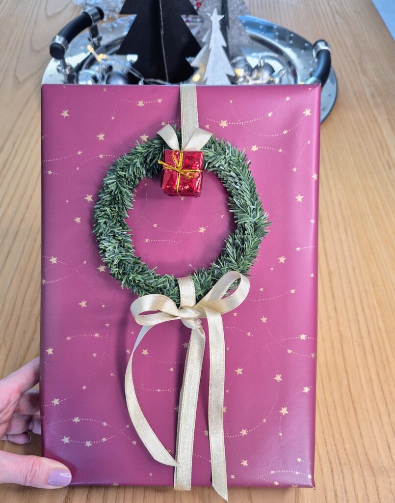- Koristeeksi laitetaan nyt pikkukranssi, pieni lahjapaketti ja lahjanarua.