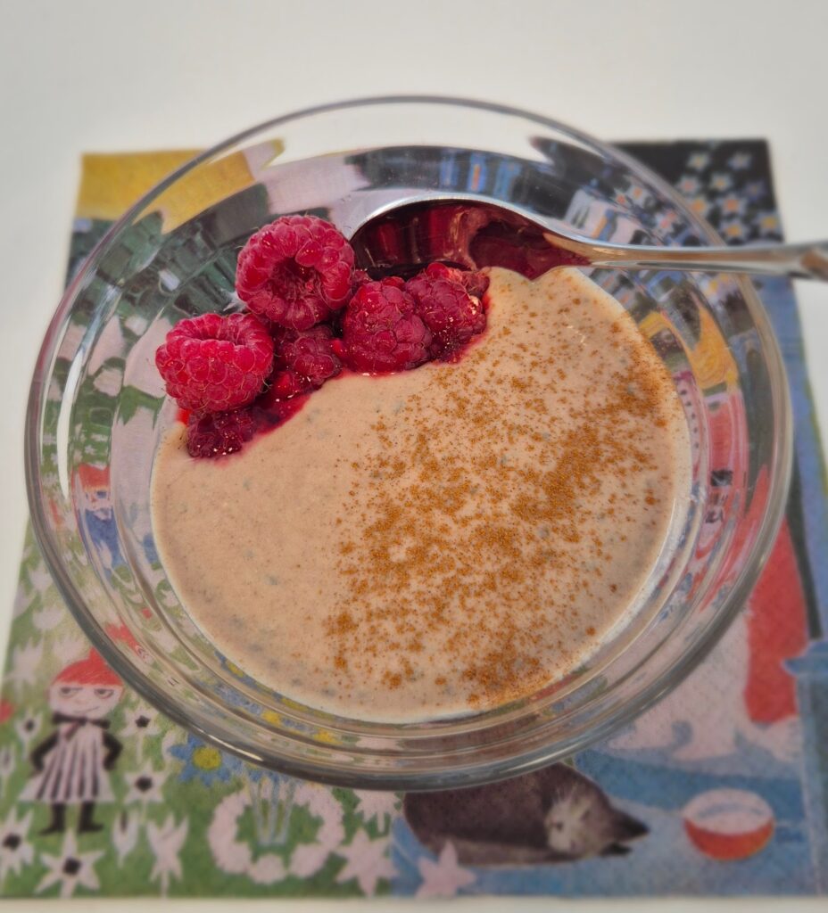 Söin tätä vanukasta pakkasesta sulatettujen mustikoiden kanssa ja oli erinomainen yhdistelmä. Mielikuvitus taitaa olla rajana miten ja minkä kanssa chiavanukkaansa nauttii. Seuraavan reseptin vanukkaan tykkään nauttia vadelmien kanssa.