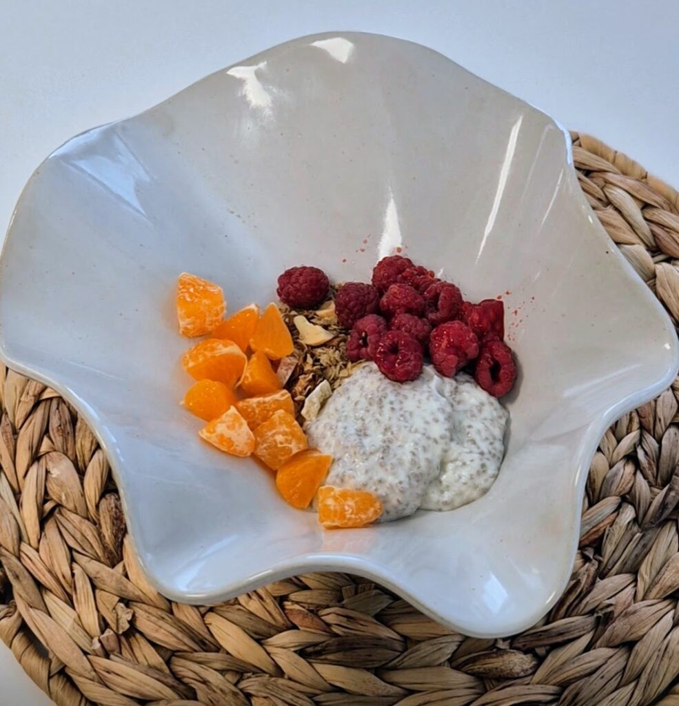 Yhdistetään vanukkaan ainekset ja laitetaan yöksi jääkaappiin tekeytymään. Seuraavana aamuna on valmiina herkullinen aamupala marjojen ja myslin kanssa nautittavaksi.