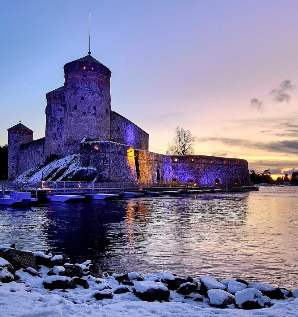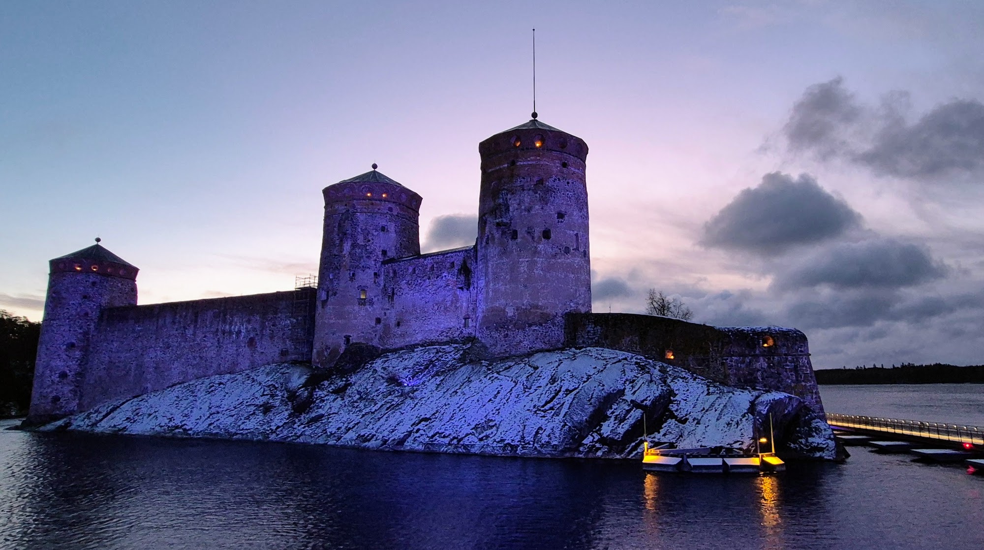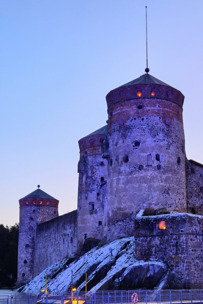 Olavinlinna on upea ilmestys jouluvalaistuksessa tai ilman.