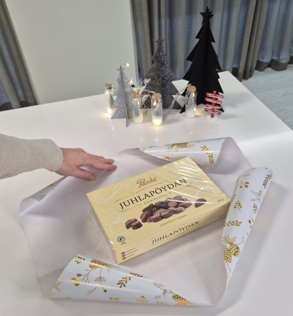 Lahjapaketoinnin aika on taas! Joulukuu mennä viilettää ja tämä postaus kertoo helpon tavan kääräistä vaikkapa konvehtirasia pakettiin pikkujouluja tai ystävän muistamista varten. Kikka on nimittäin se, että lahjan kylkeen jää pari taskua, joihin voi helposti sujauttaa vaikkapa joulukortin. Eikä lahjanarua käytetä lainkaan.
