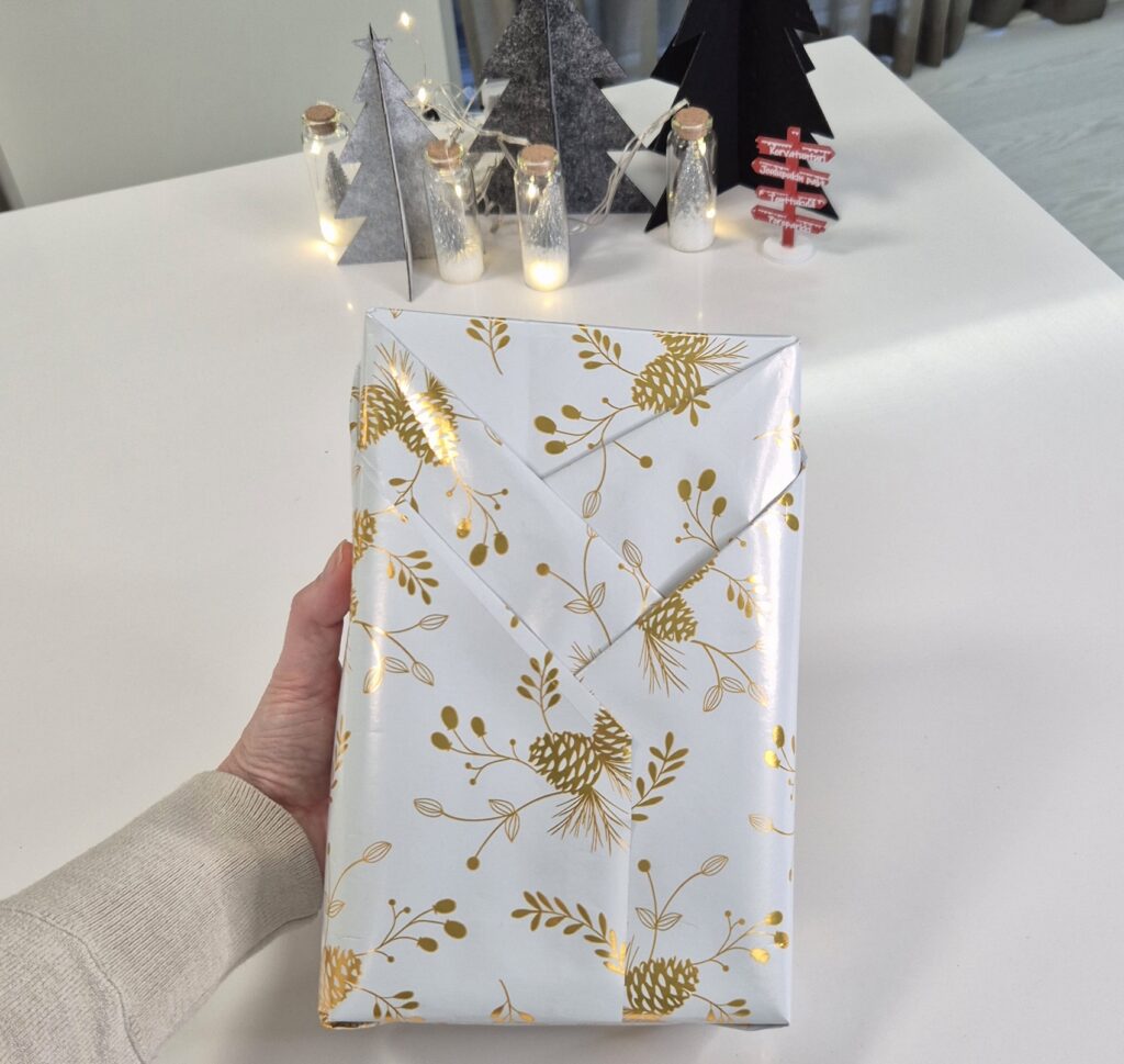 7. Ja tältä paketti näyttää, kun loput paketin sivuilla pötkötelleet paperit on käännetty lahjan päälle.