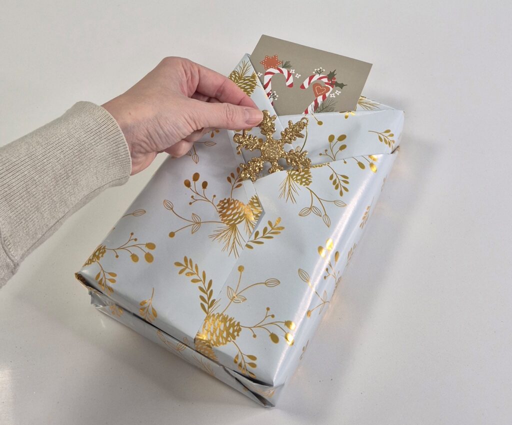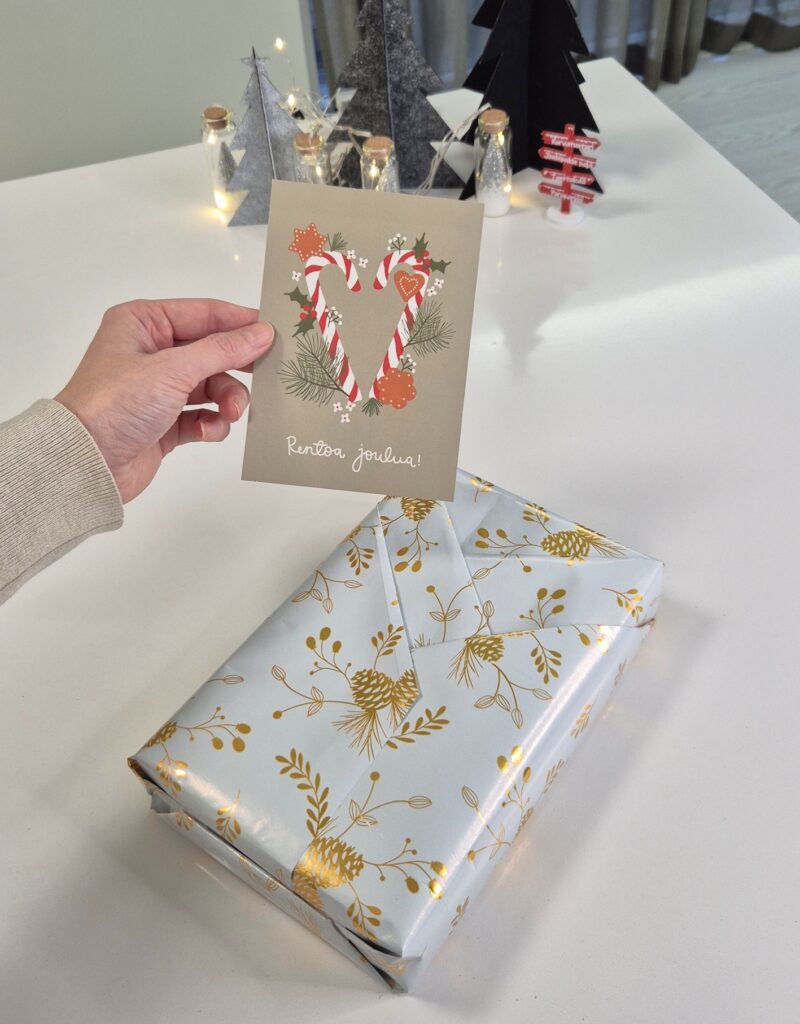 10. Pitäähän ystävää joulukortilla muistaa, joten laitetaan se paketin kylkeen taittelun tuloksena syntyneeseen taskuun.