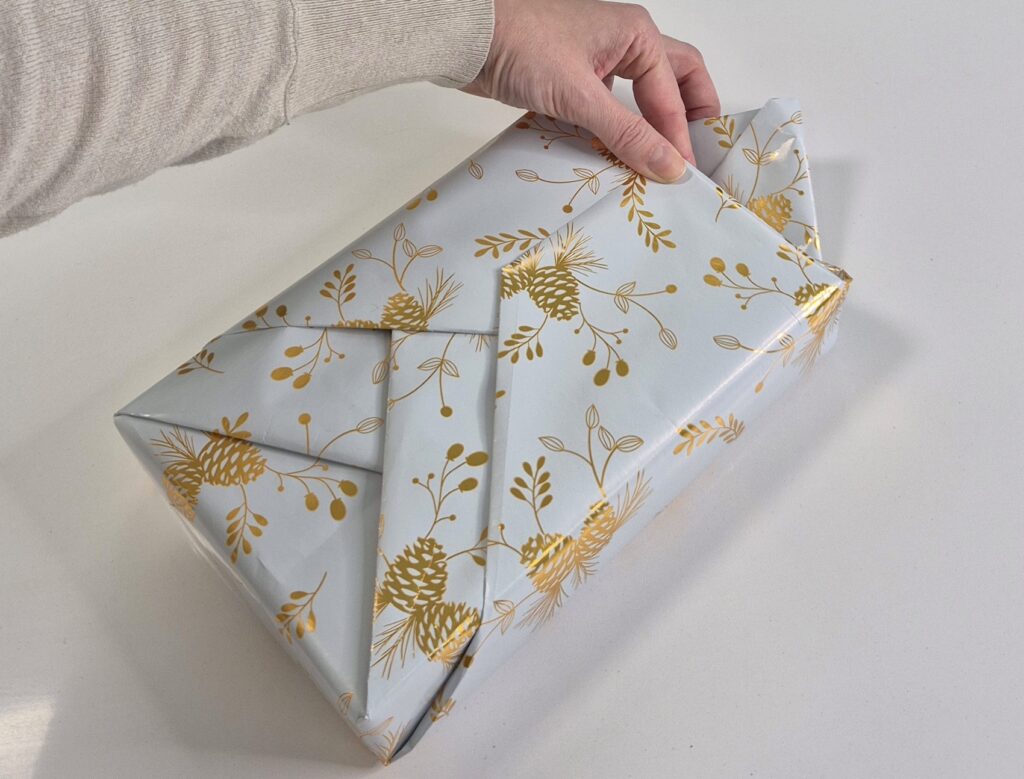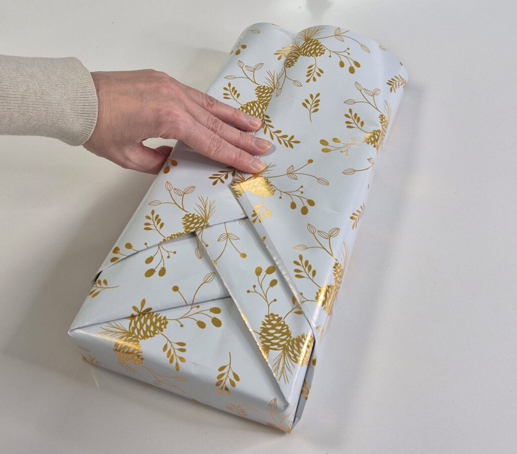 8. Lahjan pääty taitellaan perinteiseen tapaan ja teipillä kiinni.