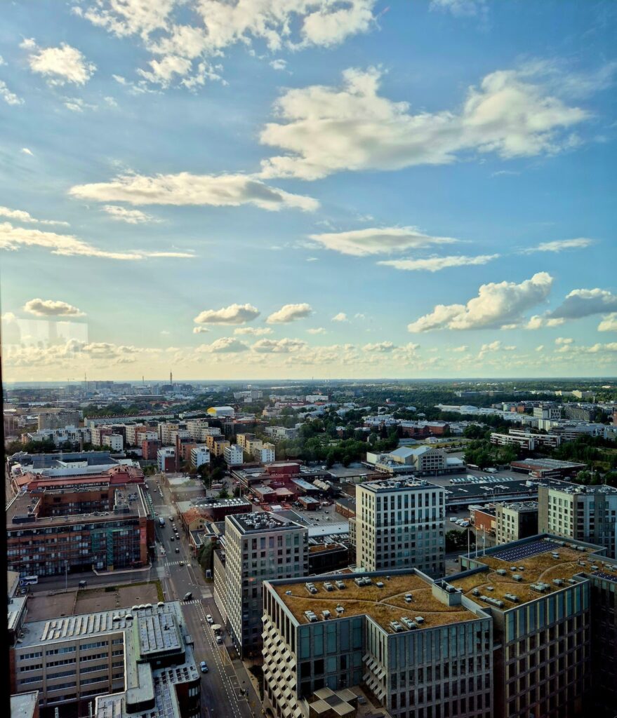 Juhlatilaisuus oli Kalasatamassa, ja hienot puitteet olivatkin. Satama bar & bistro toimi loistavasti etkojen paikkana ja mukava ravintoloitsija keitti minulle vielä kahvit siinä, kun tajusin päiväkahvien jääneen juomatta. Siinä sitten kahvia ja skumppaa vuorotellen nautiskelin. Illallinen puolestaan oli järjestetty 100 metrin korkeuteen. Ravintola Bisoubisou tarjoili huikeita maisemia Helsingin ylle sekä maukasta ruokaa. Kaunis ravintolasali että näköalaterassi. Pidin kovasti paikasta ja hyvä seura kruunasi kokemuksen. Ihanaa juhlia niin hienon porukan kesken!