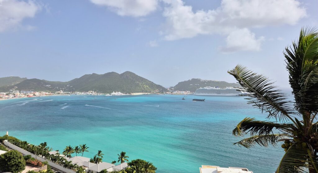Maisemat asunnolta avautuvat pääkaupunki Philipsburgiin ja vilkkaaseen lahden pohjukkaan. Saarella vierailevat risteilyalukset näkyvät samassa. Maisema on kaunis täältä kukkulan päältä katseltuna. Loma-asunto on ollut nappivalinta, ja kerrankin ihana näin todeta. Tilava, siisti ja moderni. Parvekkeella tosin vierailee iguaani, joka myös valitettavasti pökälöitsee sinne. Muuta harmia niistä ei minusta ole, vaikka omistaja kutsuikin niitä ”pests”, eli tuholaisiksi.