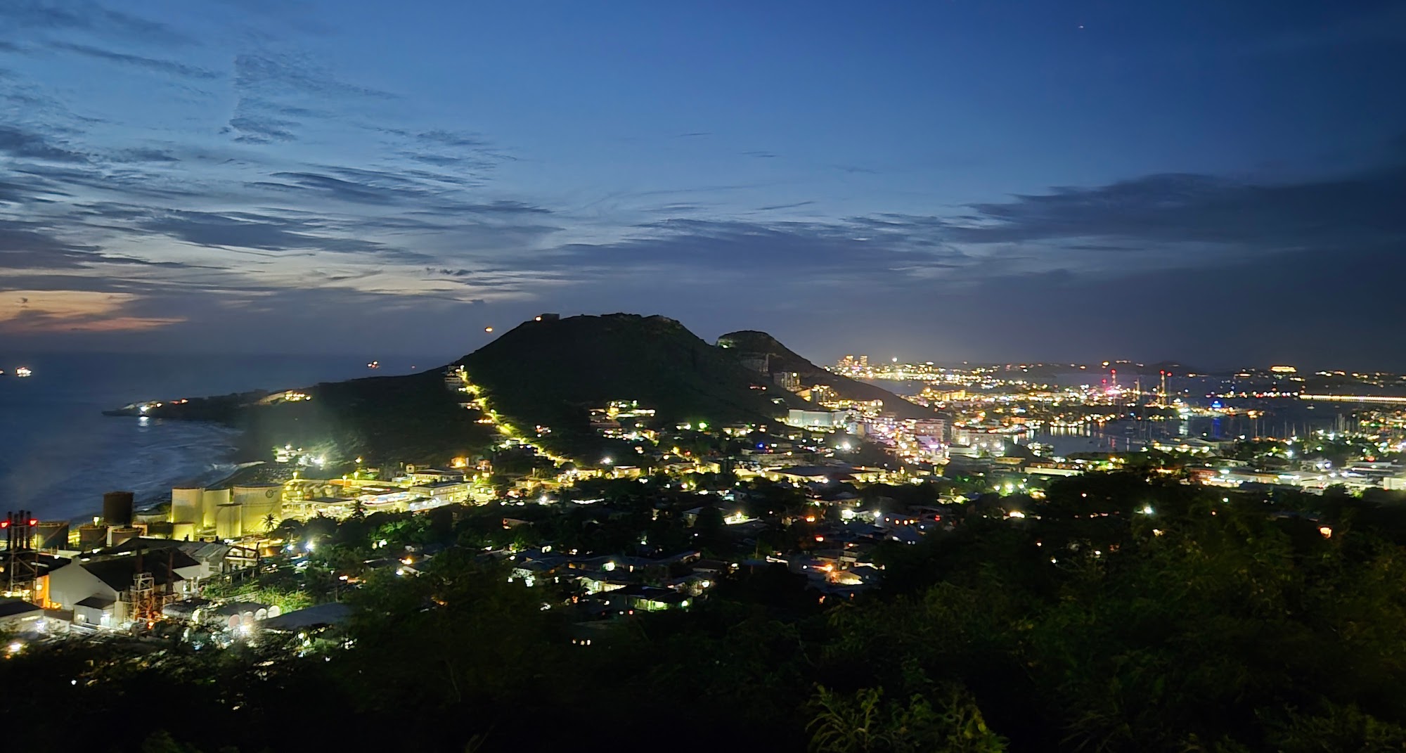 Maisemat asunnolta avautuvat pääkaupunki Philipsburgiin ja vilkkaaseen lahden pohjukkaan. Saarella vierailevat risteilyalukset näkyvät samassa. Maisema on kaunis täältä kukkulan päältä katseltuna. Loma-asunto on ollut nappivalinta, ja kerrankin ihana näin todeta. Tilava, siisti ja moderni. Parvekkeella tosin vierailee iguaani, joka myös valitettavasti pökälöitsee sinne. Muuta harmia niistä ei minusta ole, vaikka omistaja kutsuikin niitä ”pests”, eli tuholaisiksi.