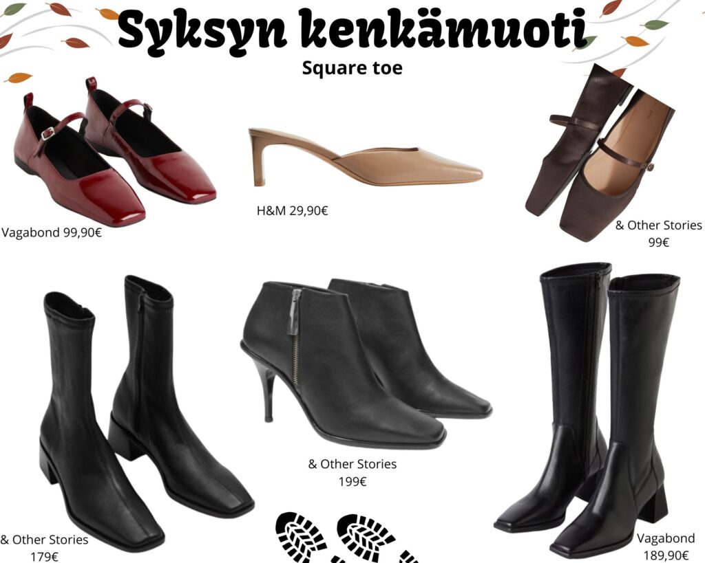 Silmiini on muutama artikkeli syksyn mittaan sattunut sekä olen myös bongannut seuraamieni muoti-influensserien kuvissa erästä hassua kenkämuotia, joka itse asiassa on hiippaillut myös minun kaappiini. Puhun siis tämän syksyn kenkätrendistä, jossa kengän kärjet ovat tasaiset ja suorastaan neliskanttiset. Tämä muoto kengissä ei ole ikinä saanut minua hihkumaan innosta, mutta viime aikoina jostain kumman syystä käytännöllisyys on tullut kuvioihin. Nimittäin rakastamani kapeat kengän kärjet aina välillä vähän vihloo vanhan jalkaa, joten vaihtelua jalkojeni vuoksi olen tehnyt hommaamalla myös leveän mallisia kenkiä.