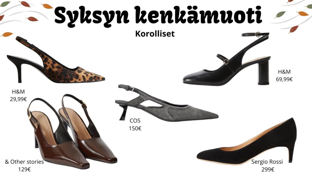 Korkkareitakin voi tarvita syksyn riennoissa ja kovin avonaista on kenkämuoti. Slingback tyyppiset kengät ovat ehdoton hitti ja siksipä tässäkin kollaasissa löytyy niitä vino pino.