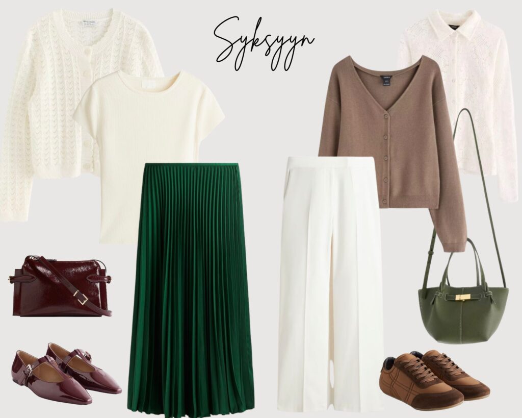 Toisen kuvakollaasin perusidea on neuletakit, koska onko syksyä ilman neuletakkeja? Kaunis perusneuletakki voi olla neulotun näköinen tai tasaisen pörröinen. Alle toppia, t-paitaa tai halutessaan kauluspaita. Valitsin mukaan ihanan pitsisen kauluspaidan, joka sopii täydellisesti neuletakkien alle. Alaosa voi alkusyksystä olla vielä hame ja kauniina päivänä vaaleat suorat housut muistuttelevat vielä menneen kesän eleganssista.