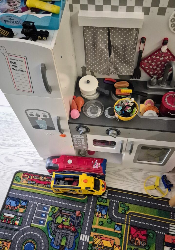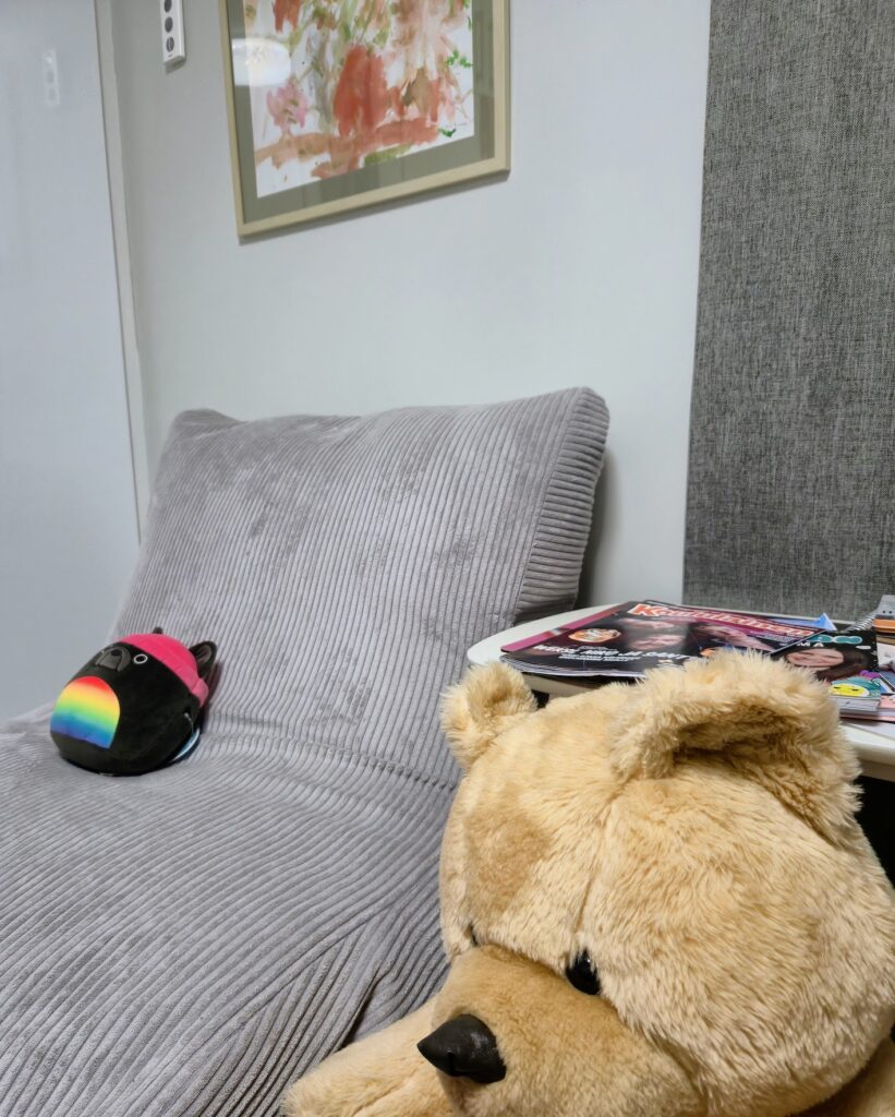 Hommasimme hänelle jämäkän säkkituolin huoneen nurkkaan. Tärkeimpiä juttuja tuntuu nyt olevan oma tila, huoneen ovi, jonka saa kiinni, erilaiset pehmolelut sekä pöytä, jossa piirtää ja taiteilla.