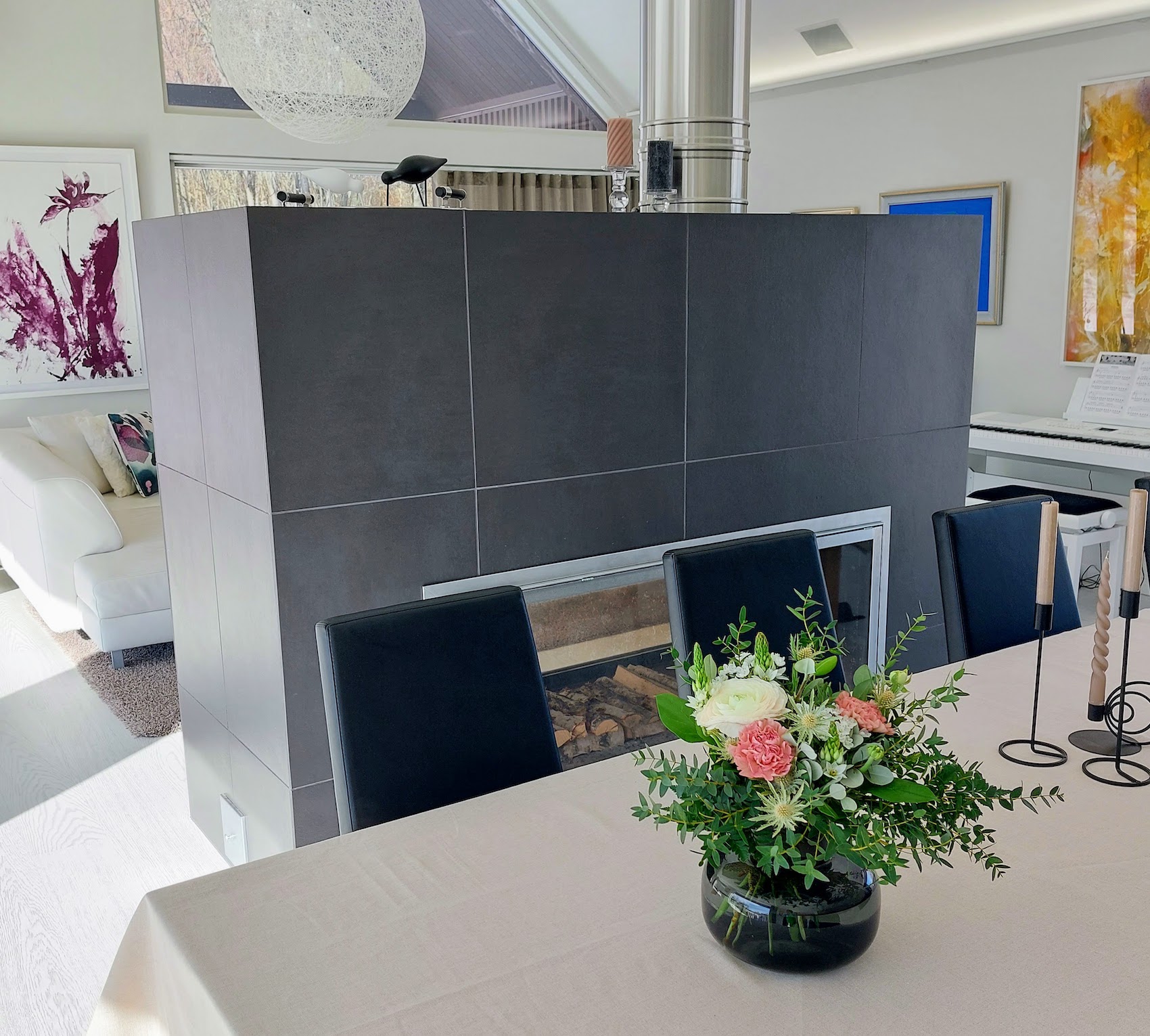Toisessa olkkarissamme on iso valkoinen nahkasohva. Juuri sellaista kalustetta en aluksi halunnut. Oikein huvitti, kun siihen lopulta päädyimme. Päädyimme, koska se olikin passeli valinta lopun viimeksi. Sohvatyynyjä vaihtamalla värimaailmaa saa muuteltua. Toki tuoreita kukkia tykkään ostaa ja nekin tuovat omalta osaltaan vaihdellen väriä tilaan.