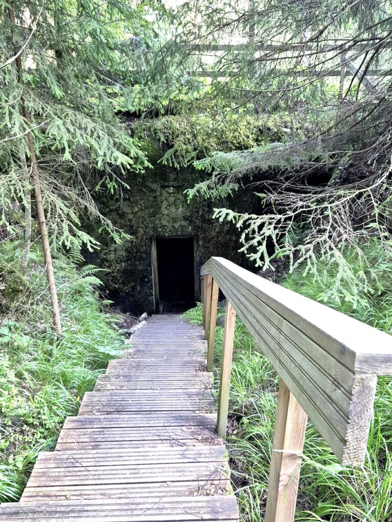 Portaat johtivat alas pienelle ovelle, josta pääsi maanalaiseen pilkkopimeään korsuun. Oli kosteaa ja aavemaista. Kännykän valo näytti meille tietä tässä vanhassa 30-hengen korsussa. Siinä ajatuksissani menin yhden kulman taakse, niin johan alkoi kiljuminen. Ei itselläni, vaan lapsilla, jotka jäivät ilman valoa pimeyteen. Palasin hakemaan heidät ja yhdessä hiippailimme korsun sokkeloisia käytäviä. Hyvin maastoutunut oli, ainoastaan konekiväärien tähystysaukot näkyivät ulospäin.