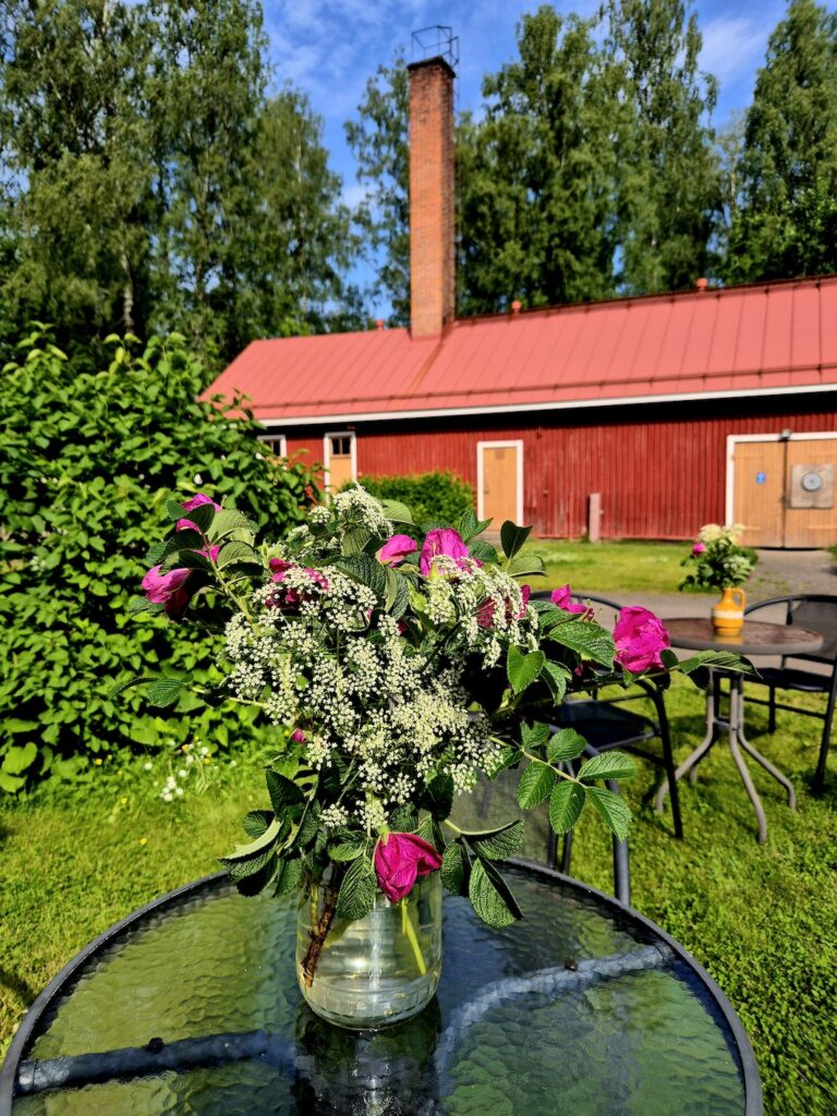 Salpalinjan Hovissa saimme käyttöömme tilavan huoneen. Pihapiirin lukuisilla istuskelupaikoilla oli mukava hengähtää ja ihailla kukkaloistoa. Sattumoisin tien toisella puolella oli Salpalinjan korsuja, joissa yhdessä lasten kanssa kävimme. Oli muuten aika jännä paikka.