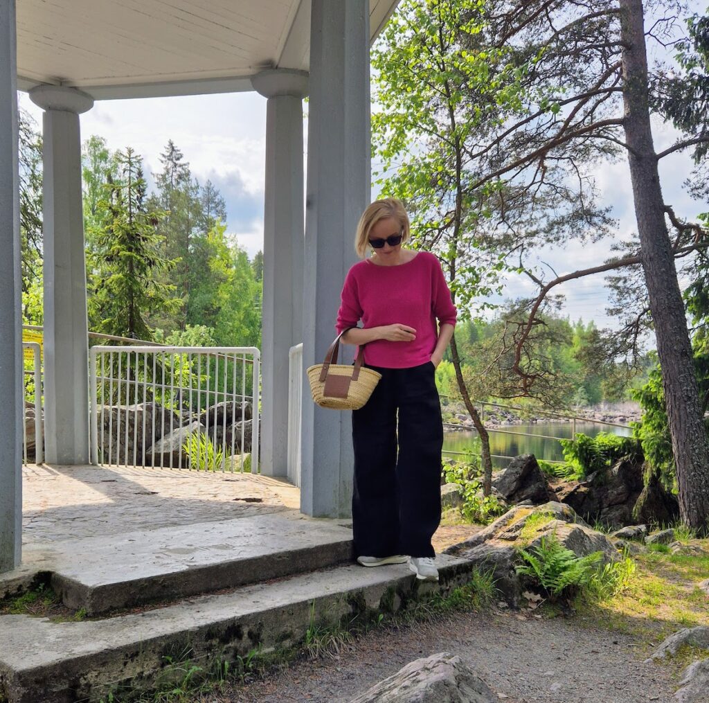 Toinen samantyyppinen laukku, jota olen paljon käyttänyt, on Loewen korikassi, pienempi versio. Tämä jos mikä on kevyt ja kesäinen. Hihnan saa pidennettyä niin, että tarvittaessa menee olkapäälle. Eiväthän nämä käsivarrella roikotettavat laukut ole maailman käytännöllisimpiä, mutta on näillekin laukkufanin asuissa oma paikkansa. Laukulla voi muuttaa asun ilmettä ja kokonaisuutta, kun valitsee rinnan yli menevän crossbodyn tai rennon (mainos)kangaslaukun olkapäälle tai tällaisen käsivarrella kuljetettavan kesälaukun.