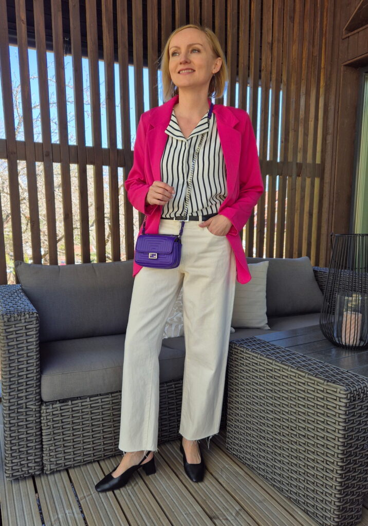 Yhden kuvan kaivoin vielä viime kesältä, koska onhan minulla yksi ”värikäs” laukku. Soma pikku Fendi joskus Vestiairesta ostettu ja jos kesällä on mitään kivoja menoja, juhlia tms. niin otan tämän pehmoista nahkaa olevan pikkulaukun mukaan. Violetti – vähän haastava väri, mutta olen sille käyttökertoja löytänyt ja kesällä jos koska saa väripilkkuja käytellä.