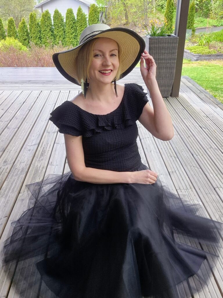 Ei unohdeta koko mustaakaan, vaikka kesästä puhutaan. Vaaleassa kesähatussa voi olla kauniit mustat yksityiskohdat, kun sen yhdistää mustaan asuun. Itse asiassa, tämän tyyppinen hattu tuo kaivattua kepeyttä ja hippusen raikkautta asukokonaisuuteen, jos lähtee juhlistamaan kokomustissa.