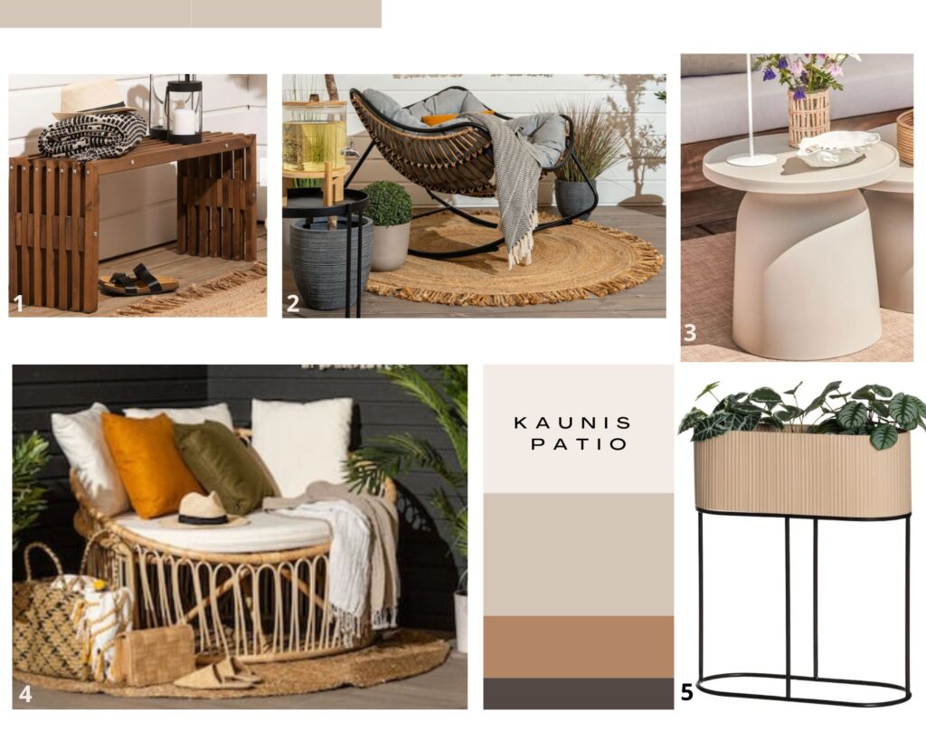 Katetun pation sisustamiseen sopii 1) virtaviivainen massiivipuusta valmistettu *Ecofurn penkki. Värinä kaunis ruskea. 2) Ulkotiloihin käyvät vaalean ruskealla värimaailmallaan erilaiset juuttimatot, ja *tässä ihana hapsulöytö eli pyöreä juuttimatto. 3) *Luonnonvalkoinen puutarhapöytä on jämäkän muotoilunsa ansiosta vakaa ja näyttävä. Materiaaliltaan kuitenkin kevyt. 4) *Rottinkituoli on saanut nimekseen Syli, enkä ihmettele lainkaan. Katsokaa nyt, tuohon syliin kaatuisi mielellään illasta toiseen. 5) *Upea ovaalinmallinen kukkateline kruunaa pation kuin pation.