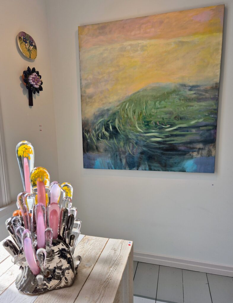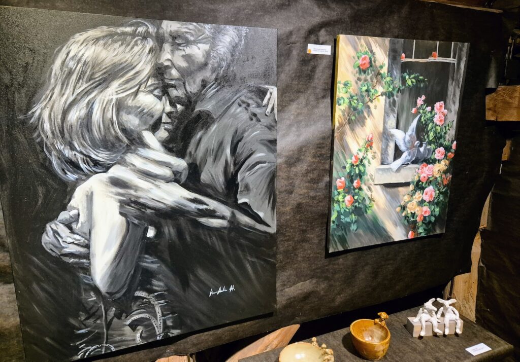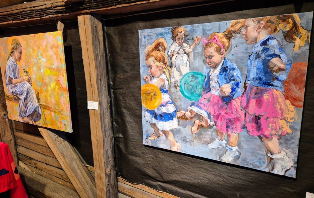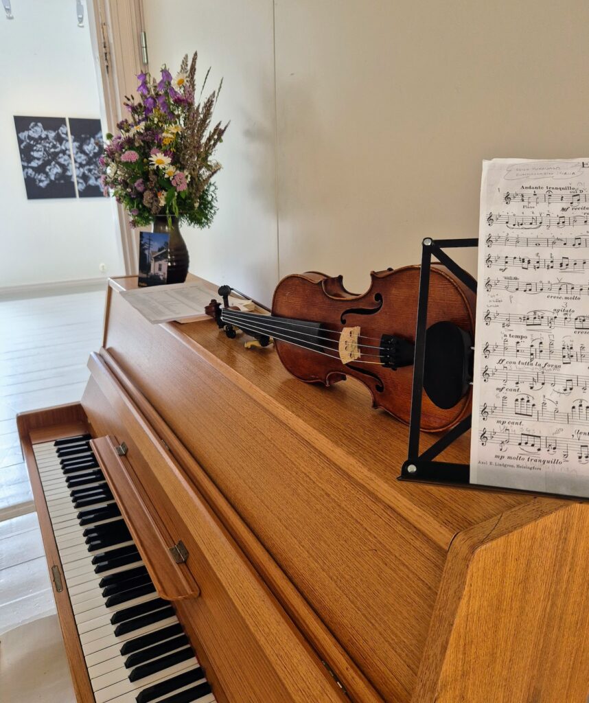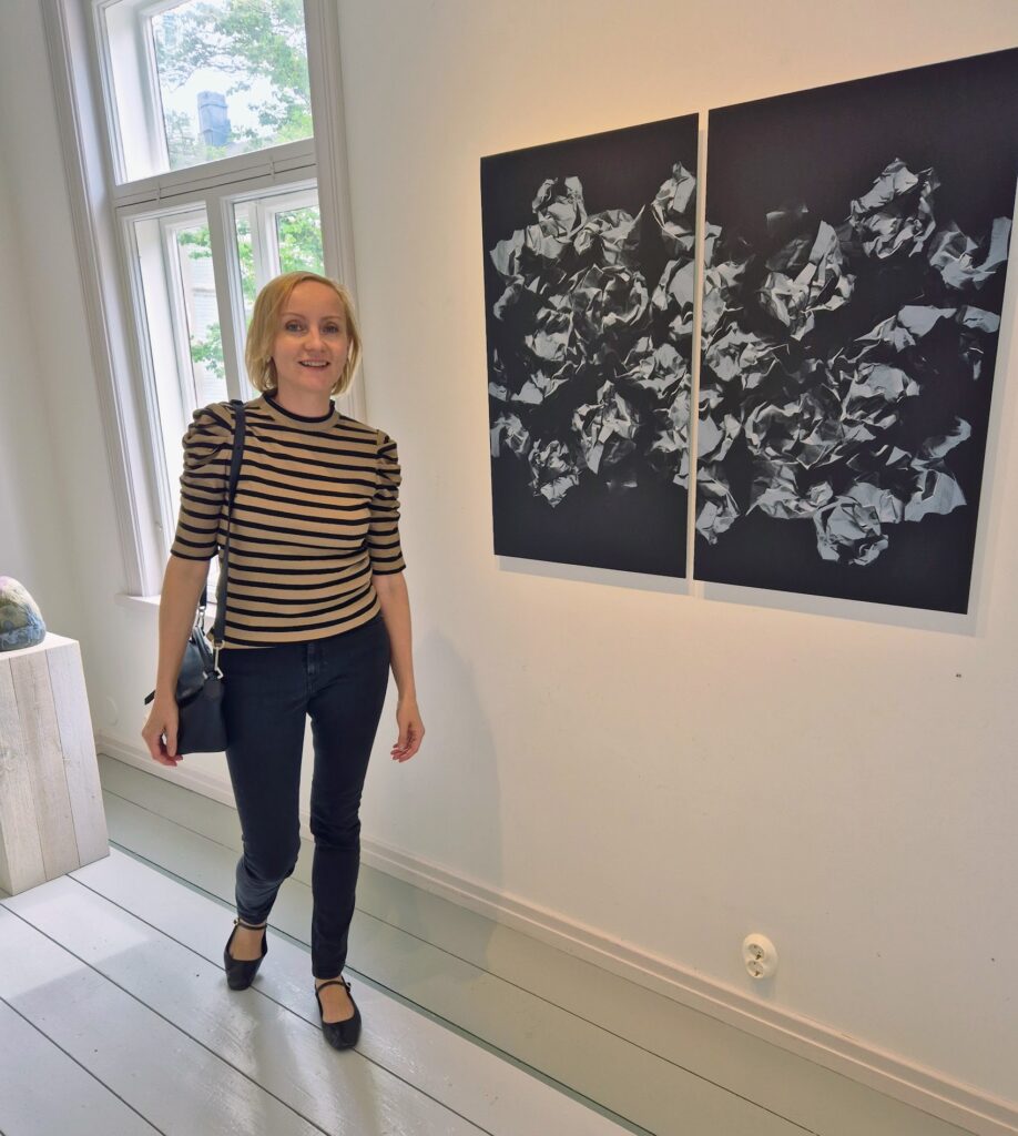 Sisäpihan kautta pääsimme kulkemaan Linnankatu 13 näyttelyyn, joka niin ikään on viehättävässä vanhassa puutalossa. Ajaton aika – taidenäyttelyssä on hieno kattaus 9 eri taiteilijan töitä ja saapuessamme houkutteleva pianonsoitto kutsui meidät sisään. Kaunis myyntinäyttely, josta olisin yhden jos toisen huolinut seinällemme. Ostohousut jalassa emme tällä kertaa olleet, vaan ihailimme vain töitä ja taiteilijoiden kädenjälkeä. Kuutti Lavosen, Matti Hintikan ja Kaisu Sirviön teoksia muun muassa löytyy täältä.