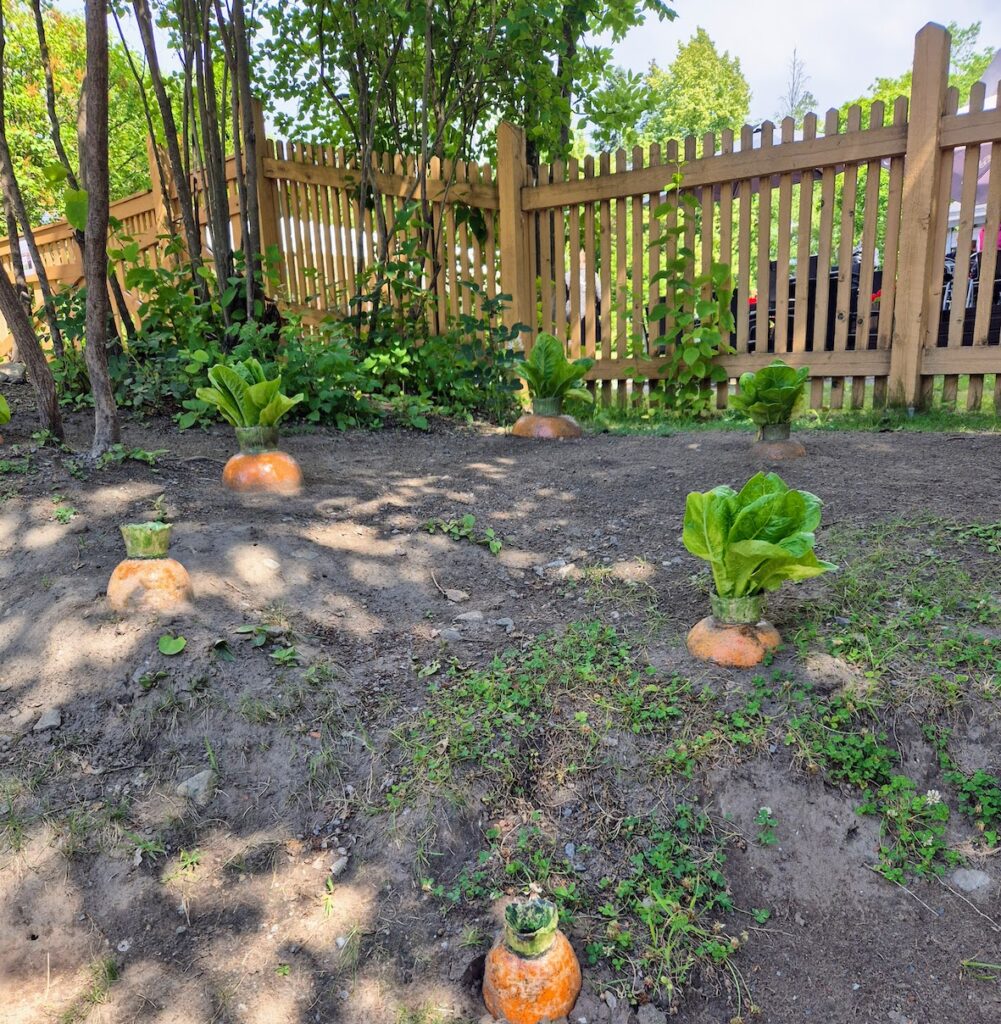 Pihamaalla oli pari kania häkissä, varjon puolella. Ei tullut kysyttyä keltään, että kesätöissäkö ne ovat vai mikä juttu, mutta tyytyväisinä ruokaansa siinä söivät ja katselivat hetken minua takaisin, kun pysähdyin ihmettelemään. Pupujen vastapäätä oli hauska ”porkkanamaa”.