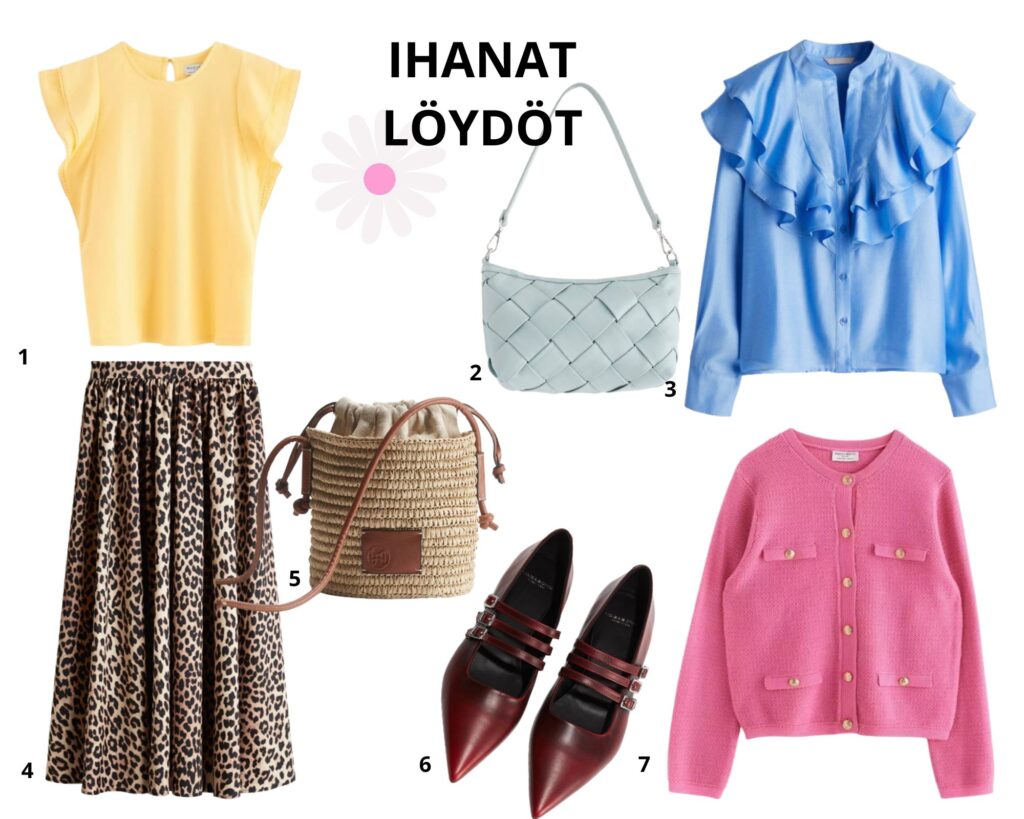 *1 Keltainen röyhelöpaita ilahduttaa kevään tullen. *2 Vaalean turkoosi pikkulaukku on oikea herkkupala. *3 Vaaleansininen paita kauniin yksityiskohdin *4 Mitä olisi kevät ilman leopardikuviota, tällä kertaa ihanan hulmuavan hameen yllä *5. Kaunis korilaukku sopii kevääseen ja kesään *6 Näissä Vagabondin nahkakengissä kelpaa toimiston käytäviä ja kevään sulaneita katuja tampata *7 Tyylikäs karkkiväri ja kullatut napit neuletakissa.