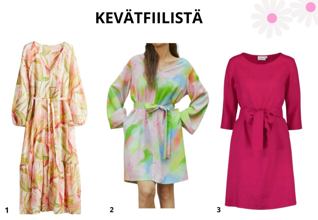 Kevätpukeutumisen iloja on vaihtaa tummat sävyt värikkäisiin. *1. H&M:n kukkakuvioinen nilkkapituinen mekko tuo kevätfiiliksen tullessaan. *2. Kotimaisen MAINIO -merkin kuosit ilahduttavat aina. Hurmaavat sävyt piristävät taatusti päivän. * 3. Nakoan säpäkkä pellavamekko kivan vyön kera sopii kevätpukeutumiseen.