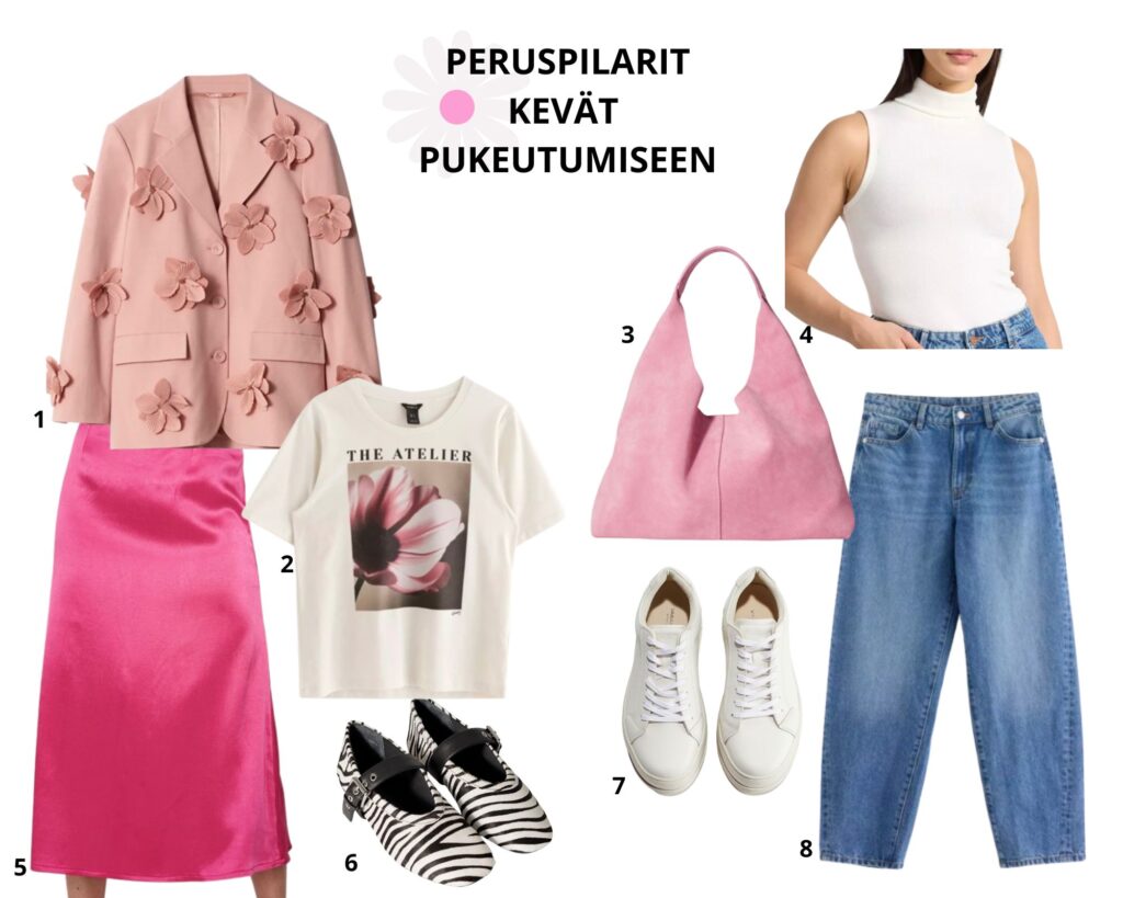 *1 Bleiserikin voi olla leikkisä *2 Ihana kukkaprintti vaaleassa t-paidassa *3 Mokkanahka näyttää aina kauniilta *4 Vaatekaapin peruspilari on valkoinen poolopaita *5 Satiinihame on kaikessa keveydessään kevään ykköshame *6 Supersöpöt balleriinat lämpimiin loppukevään päiviin *7 Valkoiset tennarit jalkaan heti, kun lumi on kaduilta kokonaan sulanut. *8 Nilkkapituiset farkut voi kevään tullen ottaa taas käyttöön