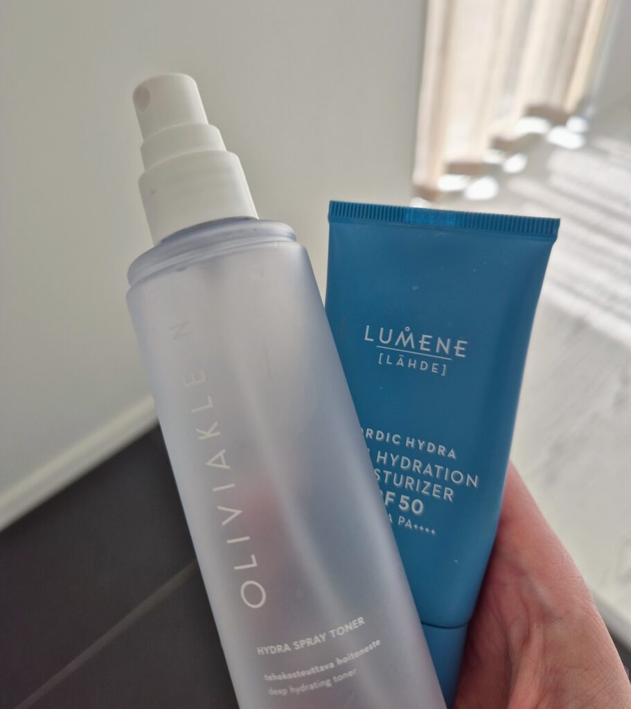 Käytän kosteuttavia kasvovesiä ympäri vuoden. Tällä hetkellä jaan Twistben valikoimista löytyvän Olivia Klein Hydra Spray Toner kasvoveden koululaiseni kanssa, jolla on epäpuhtauksia ihollaan, mutta tämä kasvovesi tuntuu kosteuttavan sopivasti myös minun pintakuivaa ihoani. Löytyy kosteuttavampiakin tuotteita varmasti, mutta nyt kun tämä on toiminut näin yllättävän hyvin, enää hippunen jäljellä, joudun kyllä tilaamaan uuden putelin lähiaikoina. Muistattehan siis, että kasvovesi ei ole vain puhdistuksen viimeistelyyn. Kasvovesi kosteuttaa ja esimerkiksi tätä * Olivia Kleinin kasvovettä suihkutellaan kasvoille, jonka jälkeen päälle levitetään seerumi ja kasvovoide.