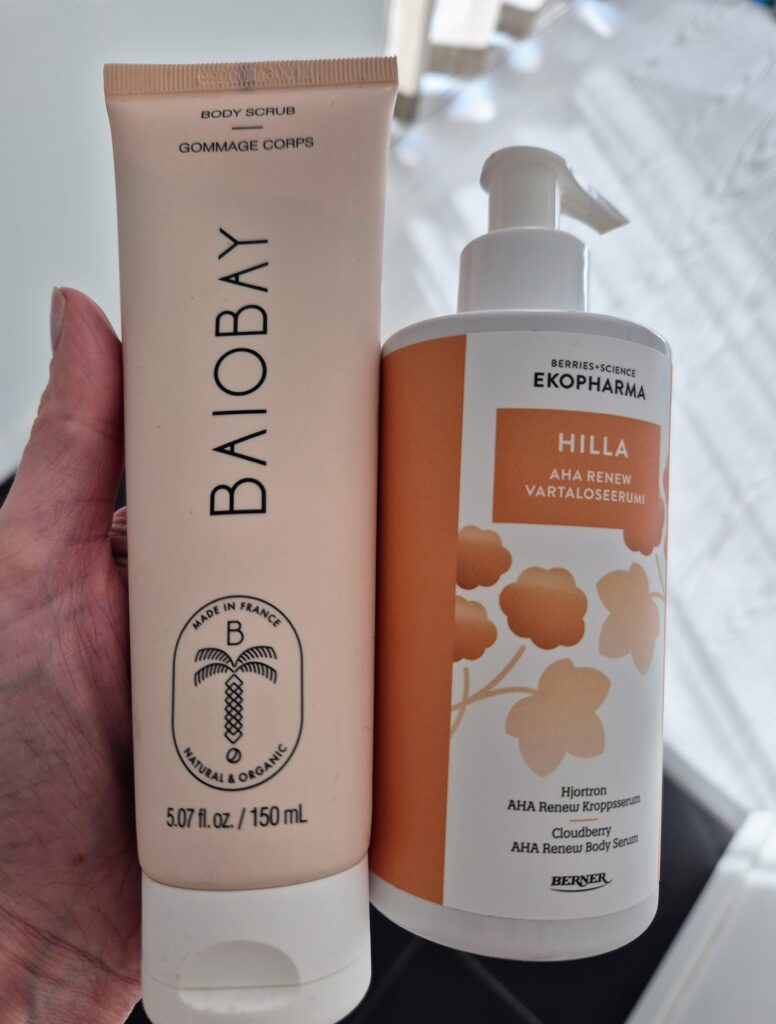 Viime aikoina on tuntunut, että ihon kuivuus vartalollakin on jotenkin ”puhjennut kukkaan”. Voi tulla ihan sietämätön kutina esimerkiksi selkään, kun nojaa tuolin selkänojaan. Ja selkään on vielä pikkaisen vaikea itse levittää sitä voidetta. Noh, siihen levitykseen minulla ei ole apuja antaa, mutta olen saanut ihon rauhoittumaan, kun aika ajoin muistaa kuoria ja sen lisäksi käyttää vartaloseerumia ja vartalovoidetta.