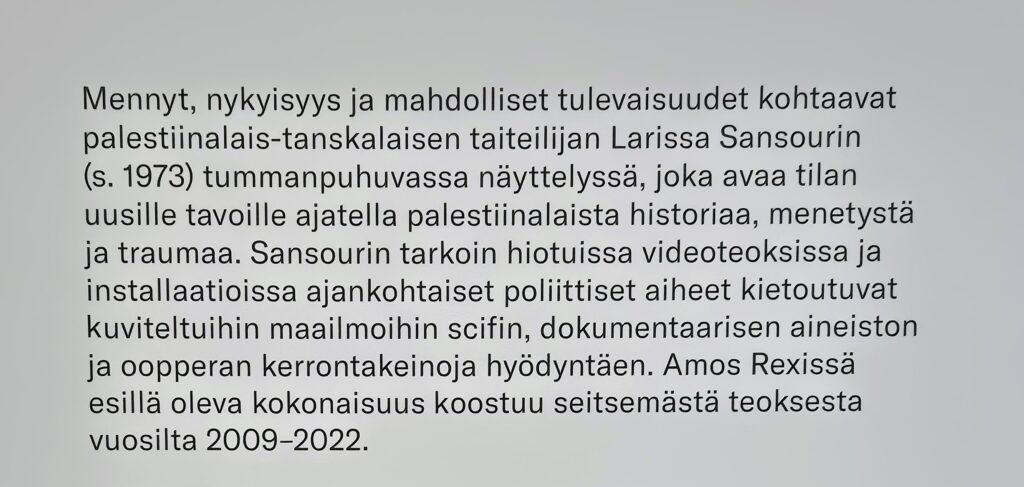 Amos Rexissä katselin tietenkin Larissa Sansourin videoteoksia. Heti siitä ensimmäisestä pidin eniten, jonka nimeä en enää muista. Kaksi naista, nuori ja iäkkäämpi keskustelevat, vähän jopa väittelevät. Muistelevat mennyttä, suunnittelevat tulevaa. Nuorempi kysyy: jos muistot voisi unohtaa kokonaan, eikä silloin olisi helpompi aloittaa ihan alusta? Vanhempi toteaa, että ehkä. Mutta silloin toistaisi vanhat virheet.