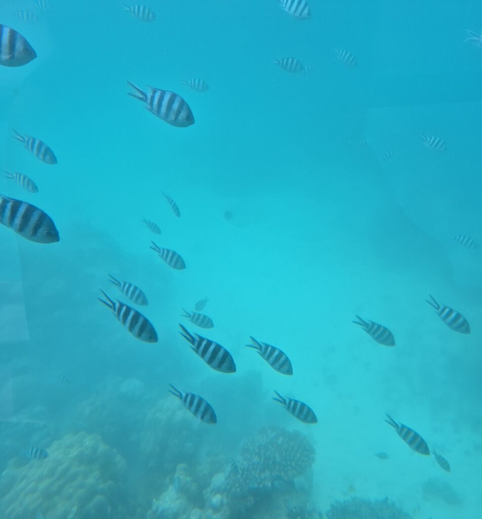 Samana päivänä jatkoimme Eden Island -nimiseen kohteeseen, joka on täynnä prameampaa lomamajoitusta ja fiinejä kauppoja. Täältä siis länsimaisia asioita löytää niin halutessaan ajattelin. Oli jopa Spar ja siellä myytiin esim. Ikean kalusteita ruokaosastojen keskellä. Syy vierailuumme saarella oli kuitenkin varaamamme pieni merimatka puolisukellusveneellä. Veneen alaosa oli lasinen ja siellä sai bongailla kaloja ja koralleja. Nuorimmaisemme, joka ei vielä snorklaa pääsi näin katsomaan meren pohjaa.