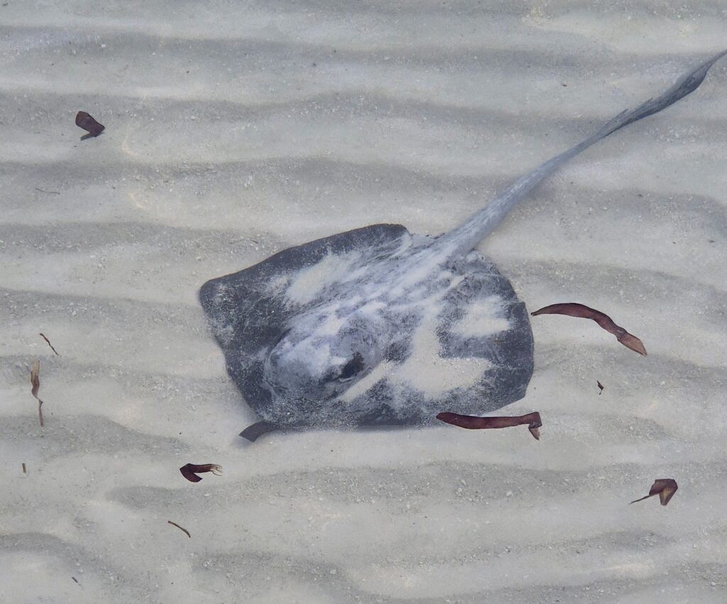 Eilen kävelimme lähirantaan iltauinnille täällä Praslinilla. Rantaviivaa on vissiin pari kilometriä. Vesi on matalaa ja kuin linnunmaitoa. Ihan heti ei uimaan päästykään, kun pieni rausku uiskenteli aivan siinä rannan tuntumassa. Ne ovat vaarattomia, mutta niillä on piikki hännän puolivälissä, joten niitä ei kannata mennä häiritsemään.