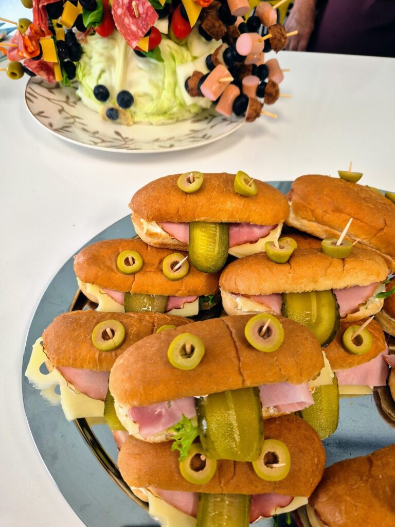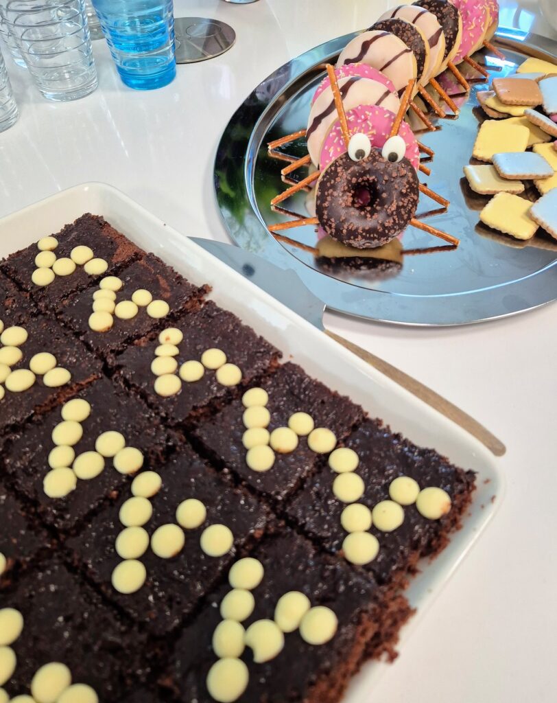 Vietimme lauantaina lapsellisia juhlia. Ainakin jos tarjoilupöytää katsoi. Joka toisella tarjottavalla oli silmät ja ehkä kielikin. Eli siilit, sammakot ja toukat vilistivät 4-v. syntymäpäiväjuhlaruokina. Vieraina oli enimmäkseen aikuisia, sekä muutama lapsi. Heinäkuun kiireissä ei taideta ikinä niitä oikea-aikaisesti keritä viettämään, mutta parempi myöhään kuin ei milloinkaan.