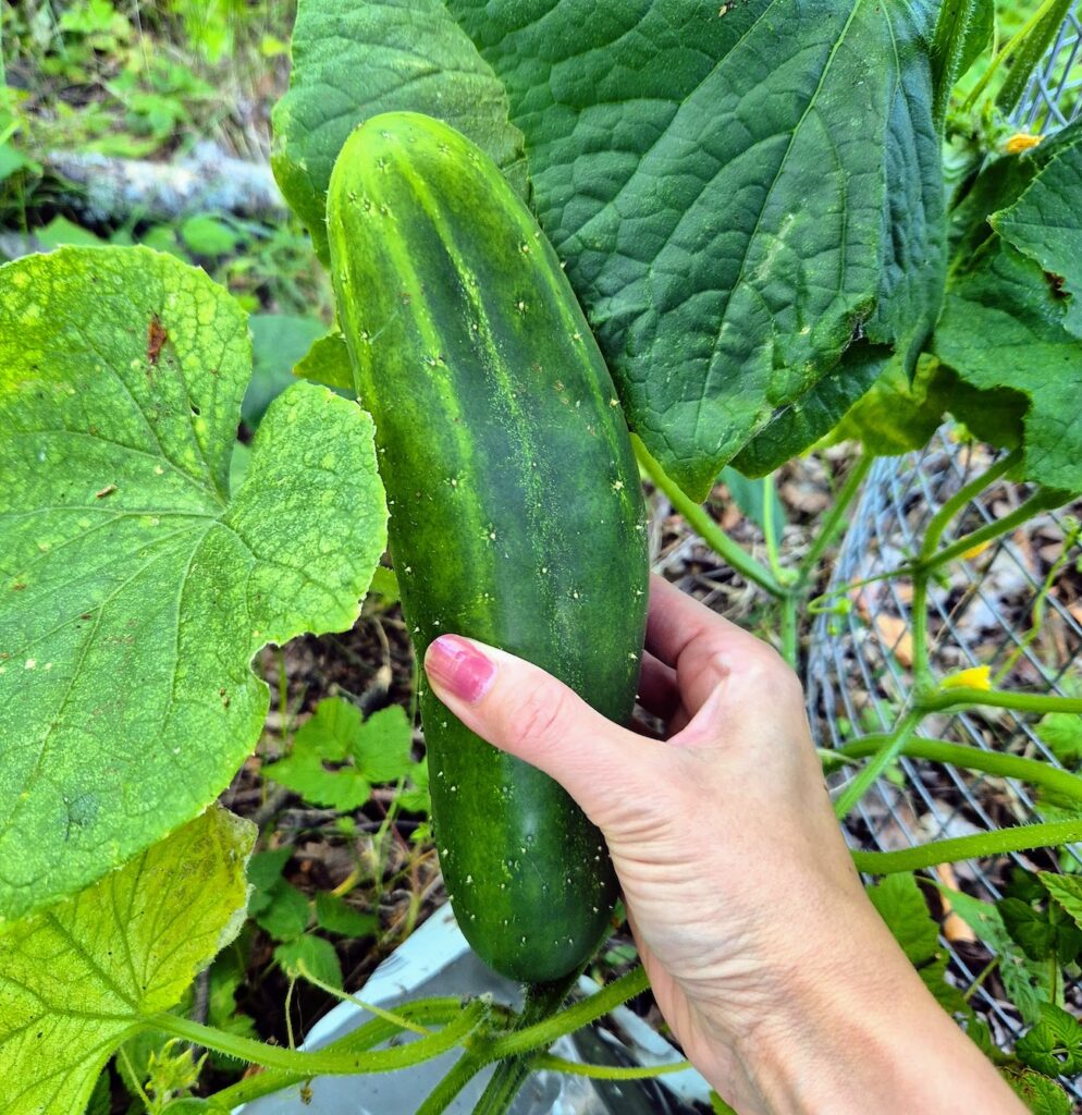 Lapsi löytyi hoidosta ja kotiin tullessamme kaunis aurinkoinen päivä houkutteli jäämään omalle pihamaalle leikkimään. Nappasin myös valmiin kurkun sisälle. Olen aina sanonut, että viherpeukaloa en omista, mutta onneksi nämä kasvit osaa kasvaa näköjään ilman sitäkin. Koululainen toi pienen kurkuntaimen kesäloman alkaessa koulusta ja se tökättiin multapussiin pihakoivun alle. Nyt ihmeekseni se tekee kurkkua, vaikka kastelu on vähän meinannut unohtua. Mutta ei liiaksi sentään, koska kurkut ovat olleet todella hyviä.