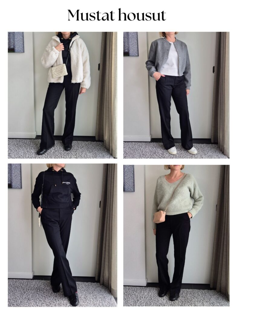 Siistit mustat housut taipuukin näköjään moneen! En ole yhtään housuihminen, eikä multa löydy esim. perus farkkuja kaapista ollenkaan, ainostaaan sellaiset rennot ”farkut” kuminauhavyötäröllä. Olen enemmän legginsimuija 😀
