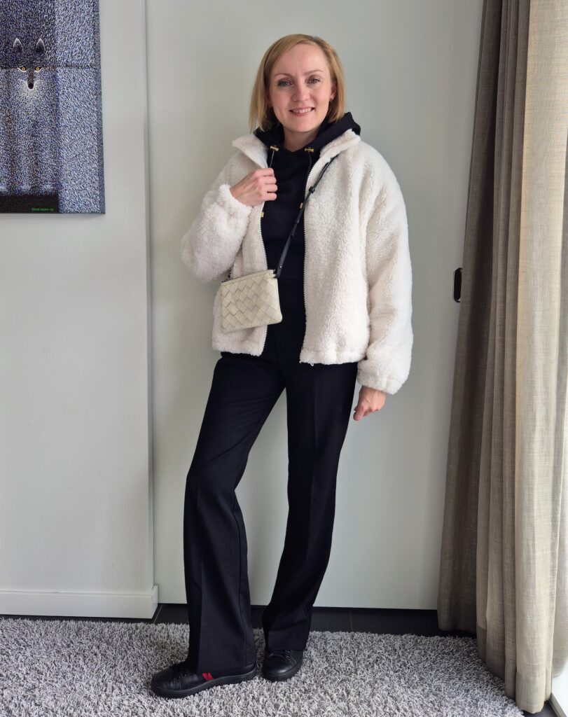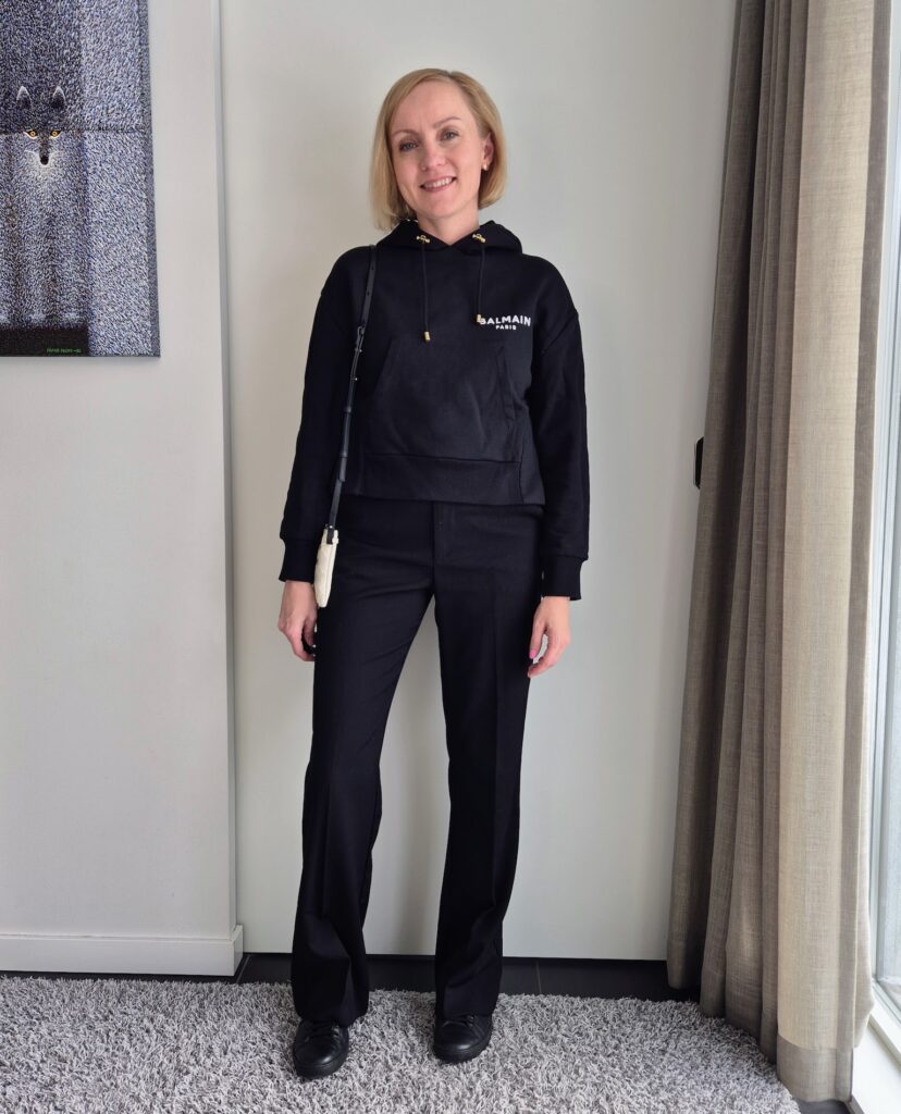 En ihan joka paikkaan huppari päällä mene, mutta yllättävän yleinen vaatekappale se alkaa olla ja näkyy enenevässä määrin mielestäni kaiken ikäisillä. Jos huppari tuntuu liian rennolta omaan käyttöön, niin sitä fiilistä voi kompensoida nimenomaan pukemalla lisäksi nämä mustat puvun housut. Vaatteilla saa leikkiä. Ja vaihtelu virkistää.