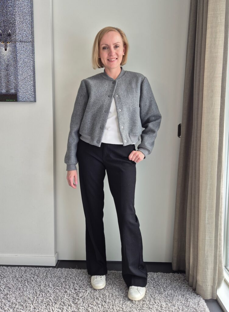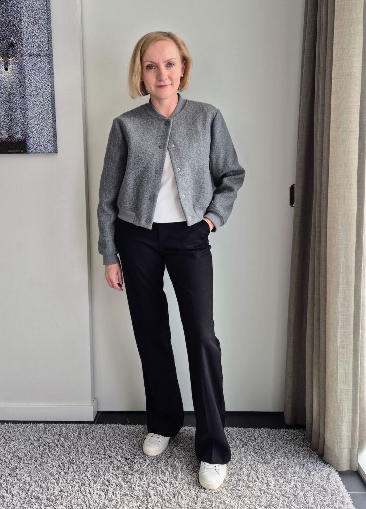 Otin omasta kaapista yhdet suorat, lahkeista prässätyt mustat housut ja ajattelin koota pari helppoa, astetta rennompaa asua housujen ympärille. Tiukka bleiseri ja kauluspaidat jäävät nyt kaappiin. Virallista toimistoasua ei nyt kaivata, vaan tyyliä, jolla lähdetään tavismenoihin, ei tapaamisiin.