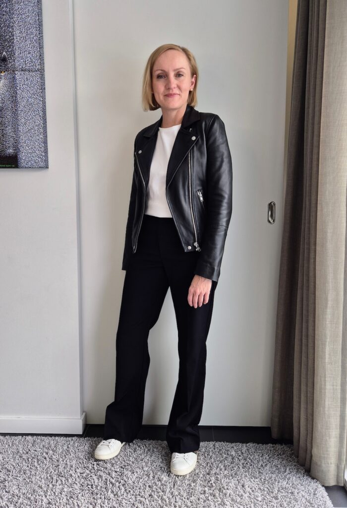 Prässätyt housut ja nahkatakki eivät ehkä ensimmäisenä tule mieleen, mutta kahden eri tyylin yhdistely onnistuu juuri näin. Asu on siitä kiva, että se ei näytä rokkarilta eikä liioin toimistotyöläiseltä. Vaan joltain ihan muulta. Valkoinen tennarit ovat aika lailla ikivarma valinta taaten rennon viimeistelyn asulle.