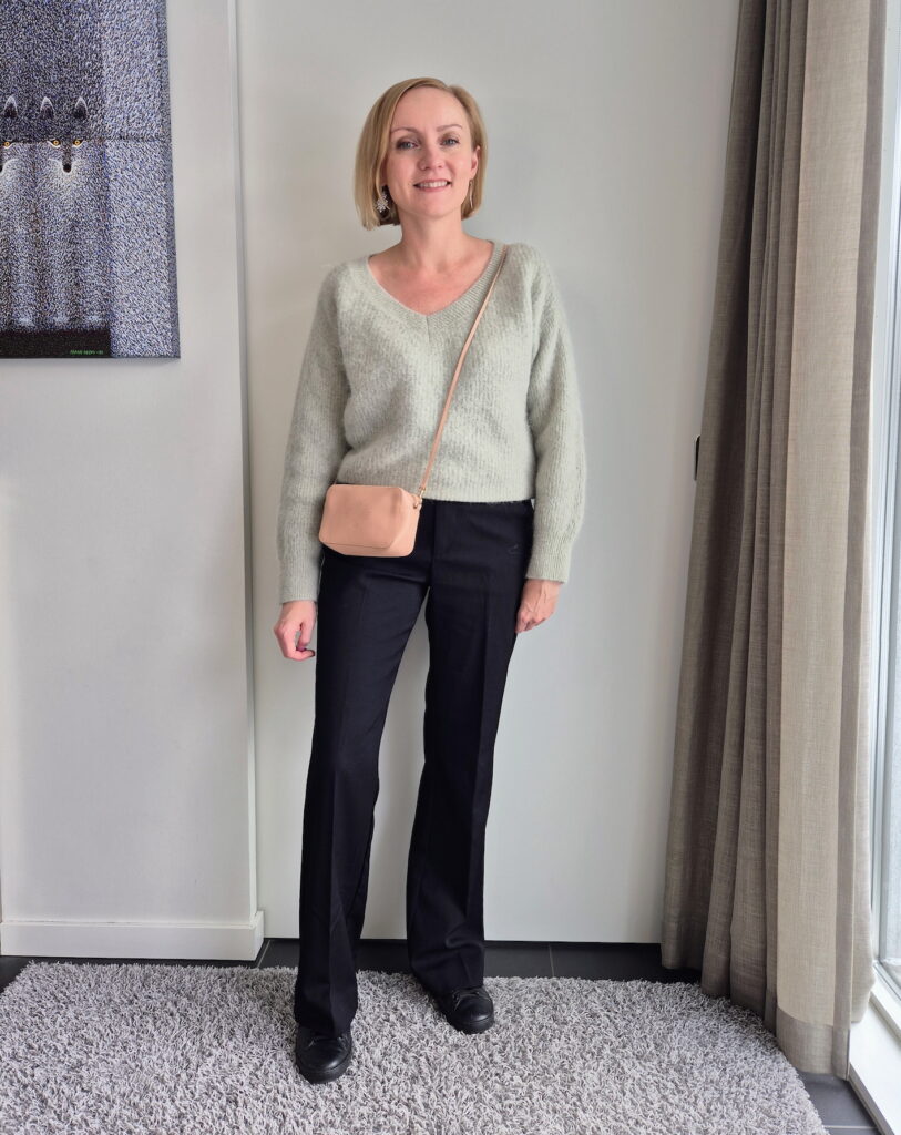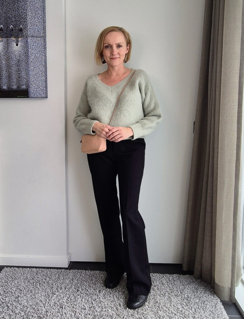 Hempeää ja miksei samalla myös pörröistä. Pehmoisen villapaidan kanssa mustat housut eivät tuo niin ylipuettua oloa. Pidän tästä vaalean vihreästä pehmopaidasta, joka vie prässätyistä housuista liiallisen pönöttämisfiiliksen. Jos neule on yhtään isompaa sorttia, sellainen trendikkäästi ylisuuri, niin laittaisin etuosan housun reunan alle ja antaisin takaosan laskeutua vapaasti.