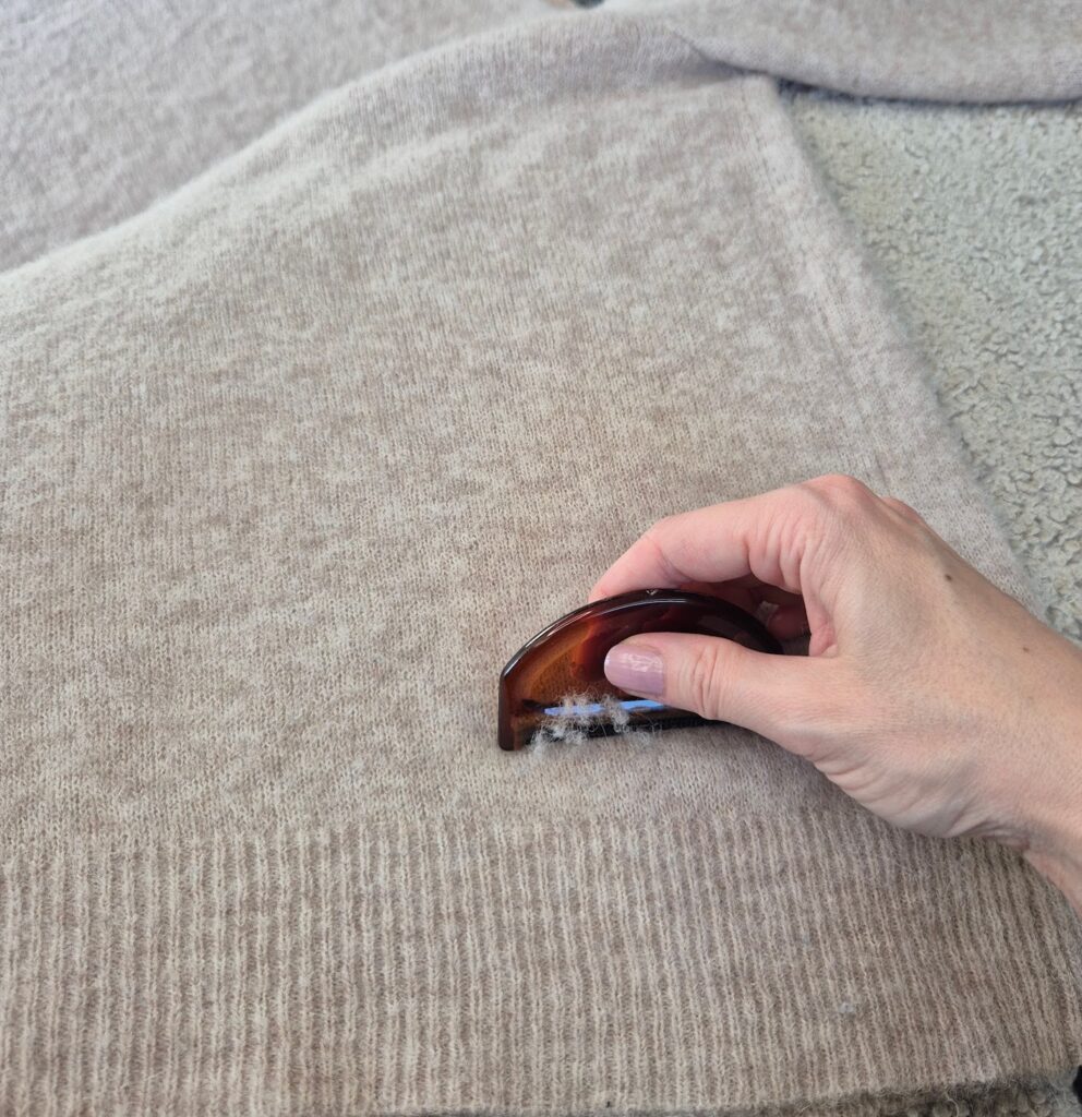 Tarkoitukseni oli kokeilla villakampaa toiselle puolelle paitaa ja sheivaushöylää toiselle. Aloitin laittamalla villapaidan vaakatasoon ja vetelin pintaa ensin villakammalla. Se on näppärä väline, tykkään. Toki kannattaa varoen käytellä, ettei riko neuletta.